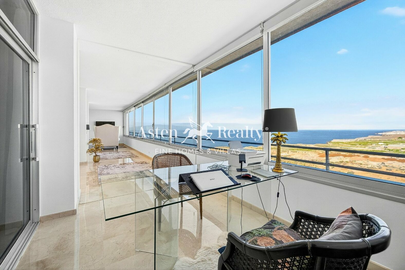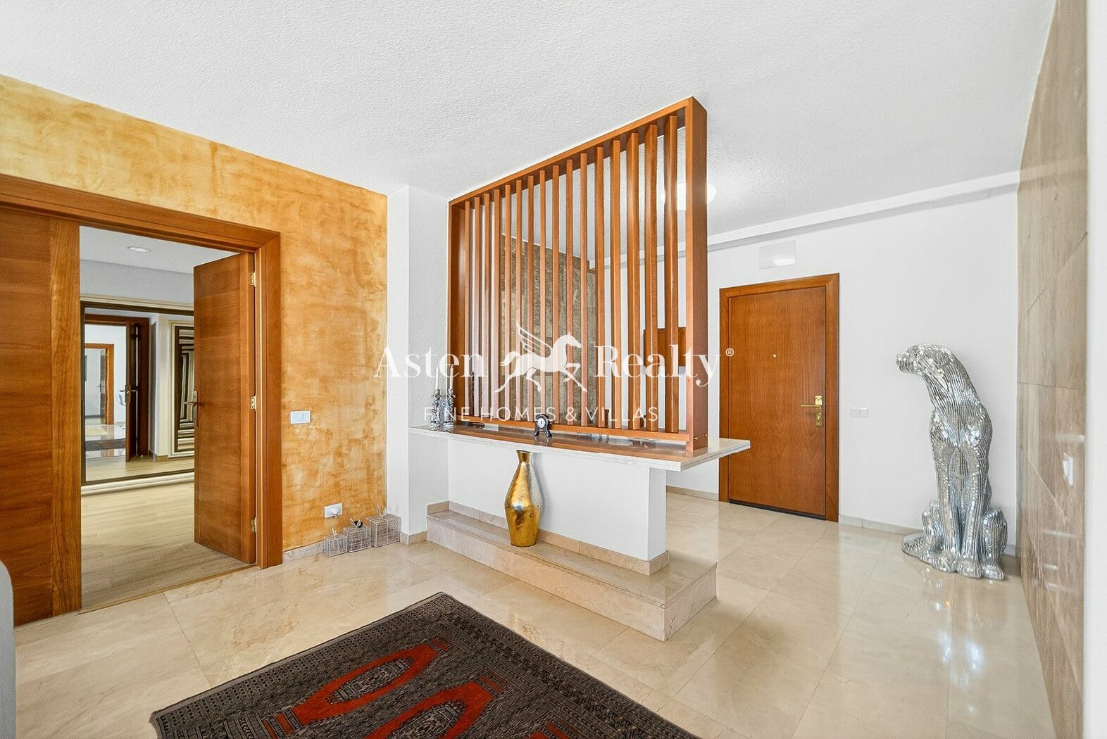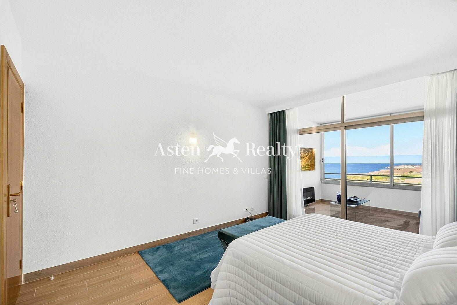 Das Innendesign kombiniert goldene Töne, edle Hölzer, Blau- und Weißtöne und schafft warme und elegante Räume. Die Wohnung wurde kürzlich renoviert und geschmackvoll möbliert.