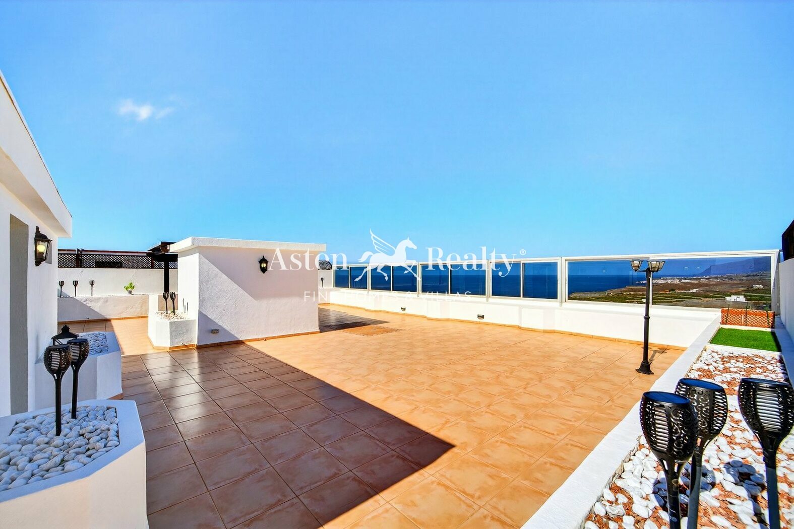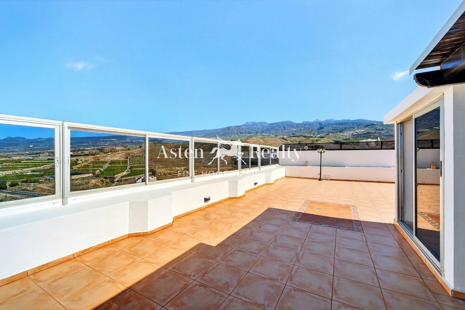 Von der großzügigen Terrasse aus genießen Sie spektakuläre 180°-Ausblicke auf den Ozean, die Küste mit ihren Bananenplantagen und die imposante Silhouette des Teide.