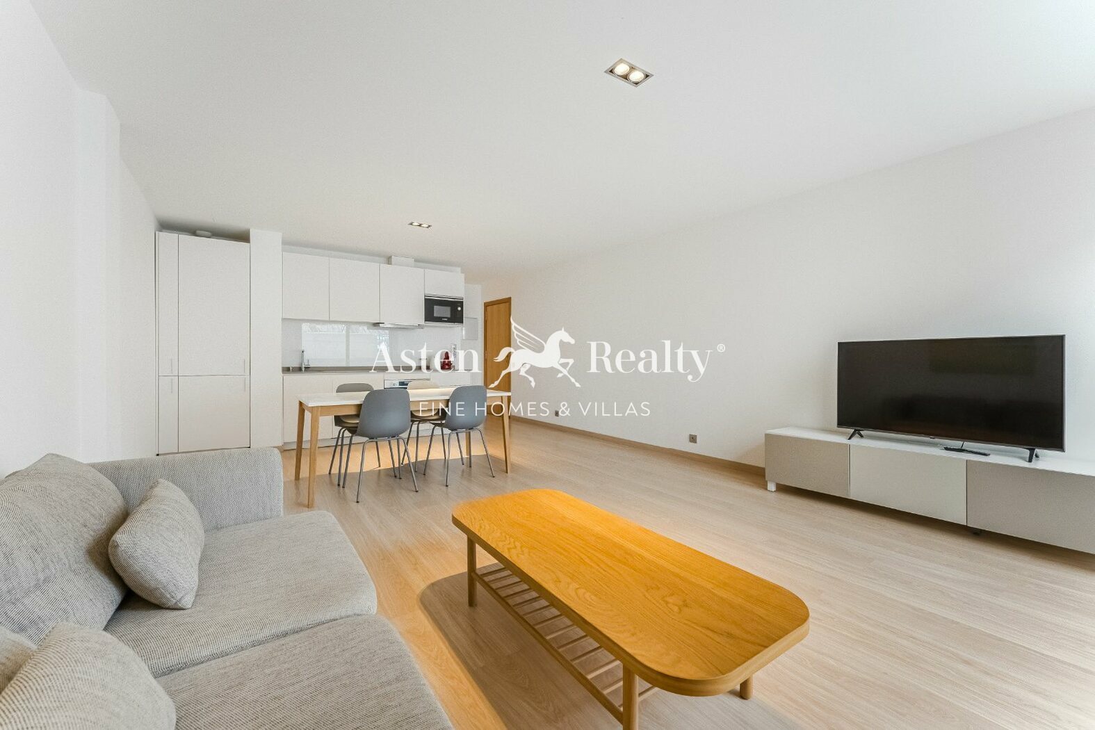 Die Immobilie bietet ein modernes und funktionales Design mit einer Innenfläche von 64 m². Sie verfügt über ein Doppelzimmer mit Einbauschrank und Zugang zu einem kleinen Balkon, ein modernes Badezimmer mit bodengleicher Dusche und ein helles, offenes Wohnzimmer, das eine voll ausgestattete weiße Küche mit Einbaugeräten, einen Essbereich und einen gemütlichen Wohnbereich umfasst. Die gesamte Wohnung besticht durch ihre Holzimitatböden und eine Einrichtung in neutralen Farbtönen, die Eleganz und Wärme ausstrahlen.