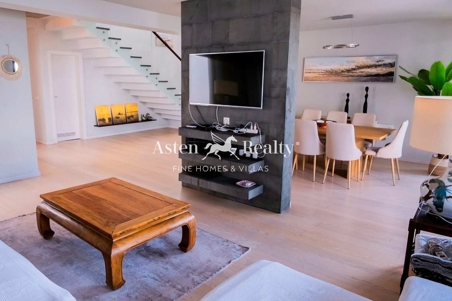 Die Villa verfügt über drei Ebenen: zwei Hauptetagen und ein multifunktionales Erdgeschoss. Vom privaten Eingang aus spürt man die Ruhe der Umgebung, umgeben von gepflegten Gärten mit Palmen, tropischen Pflanzen und Obstbäumen, die eine natürliche und einladende Atmosphäre schaffen. Im Hauptgeschoss öffnen sich die Räume dem natürlichen Licht und dem Meerblick. Ein elegantes Hauptwohnzimmer ist mit einer großen Terrasse verbunden, die sich ideal zum Entspannen oder für Mahlzeiten im Freien eignet. Die separate, voll ausgestattete Küche bietet Funktionalität und direkten Zugang nach draußen.