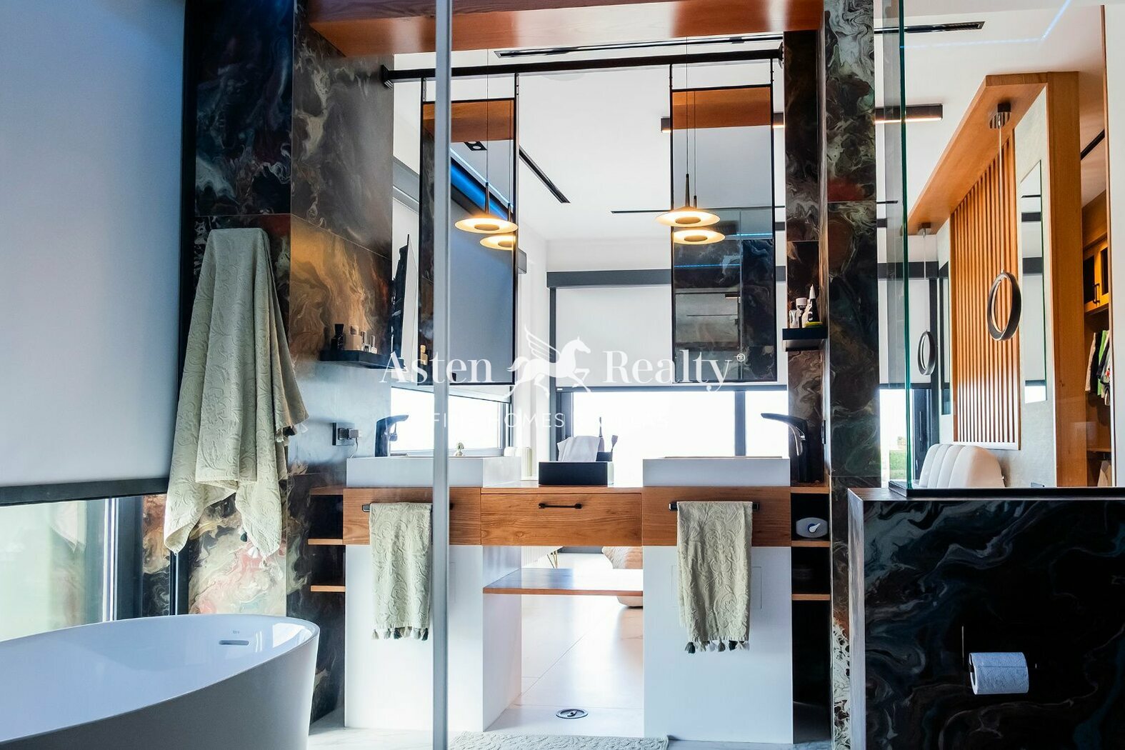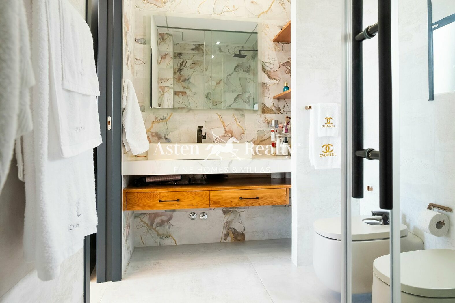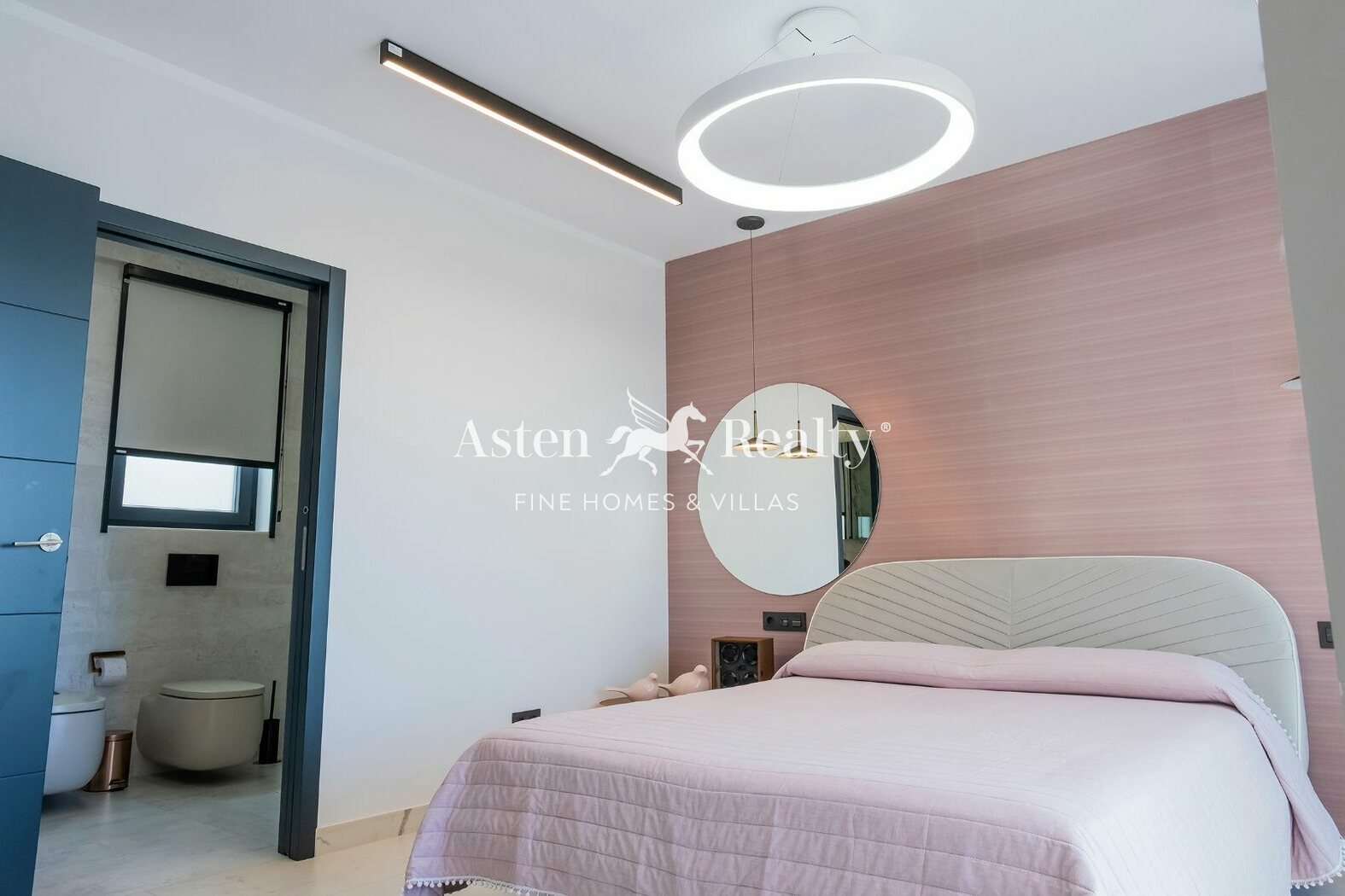 Im Obergeschoss bieten drei Schlafzimmer-Suiten Privatsphäre und Komfort. Jedes verfügt über ein eigenes Bad, einen begehbaren Kleiderschrank und eine Terrasse, von der aus Sie den Sonnenuntergang über dem Ozean betrachten können. Qualität ist in jedem Detail spürbar: großformatige Feinsteinzeugböden, lackierte Tischlerarbeiten, warme Oberflächen und hocheffiziente Isolierung.