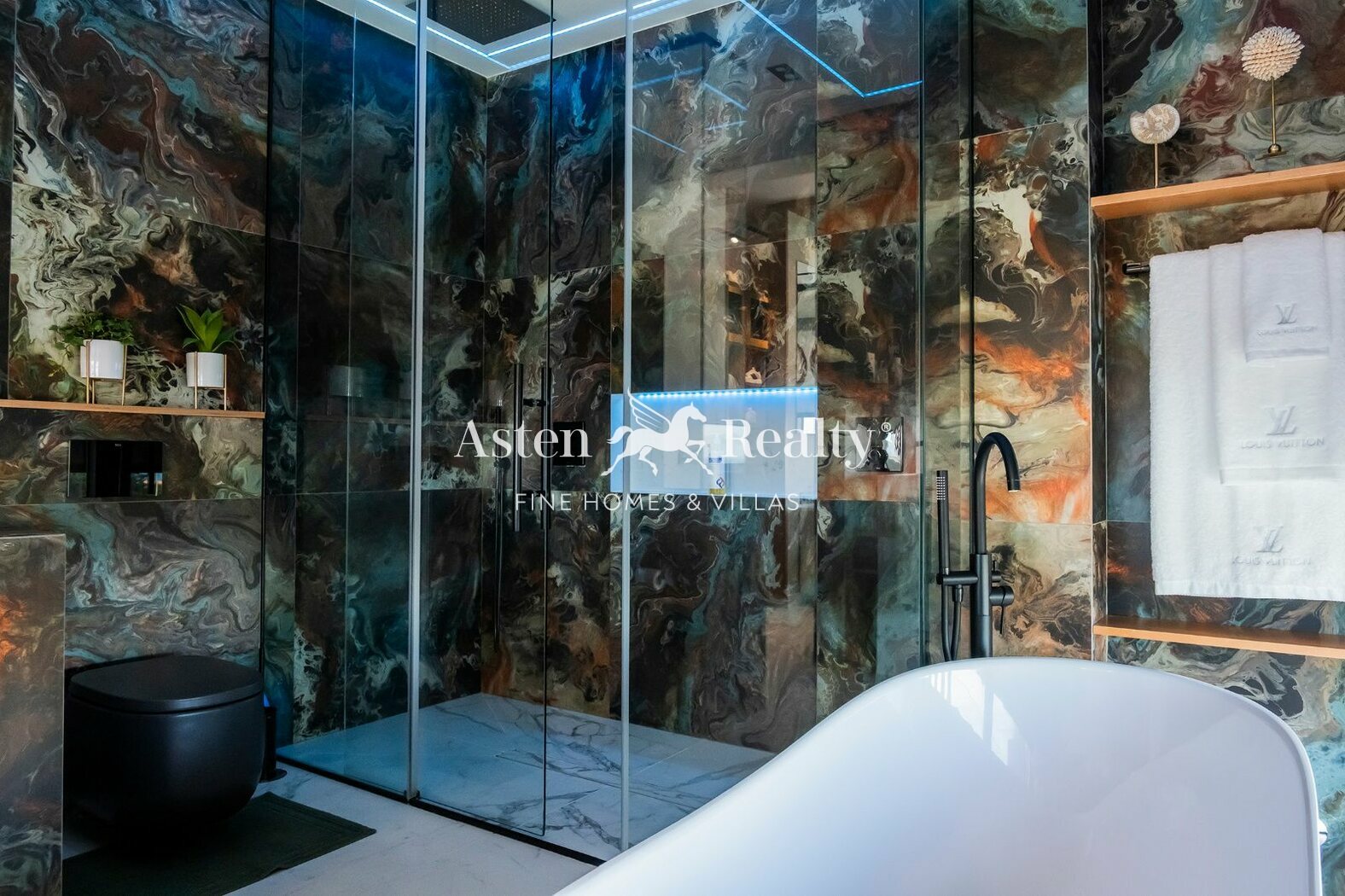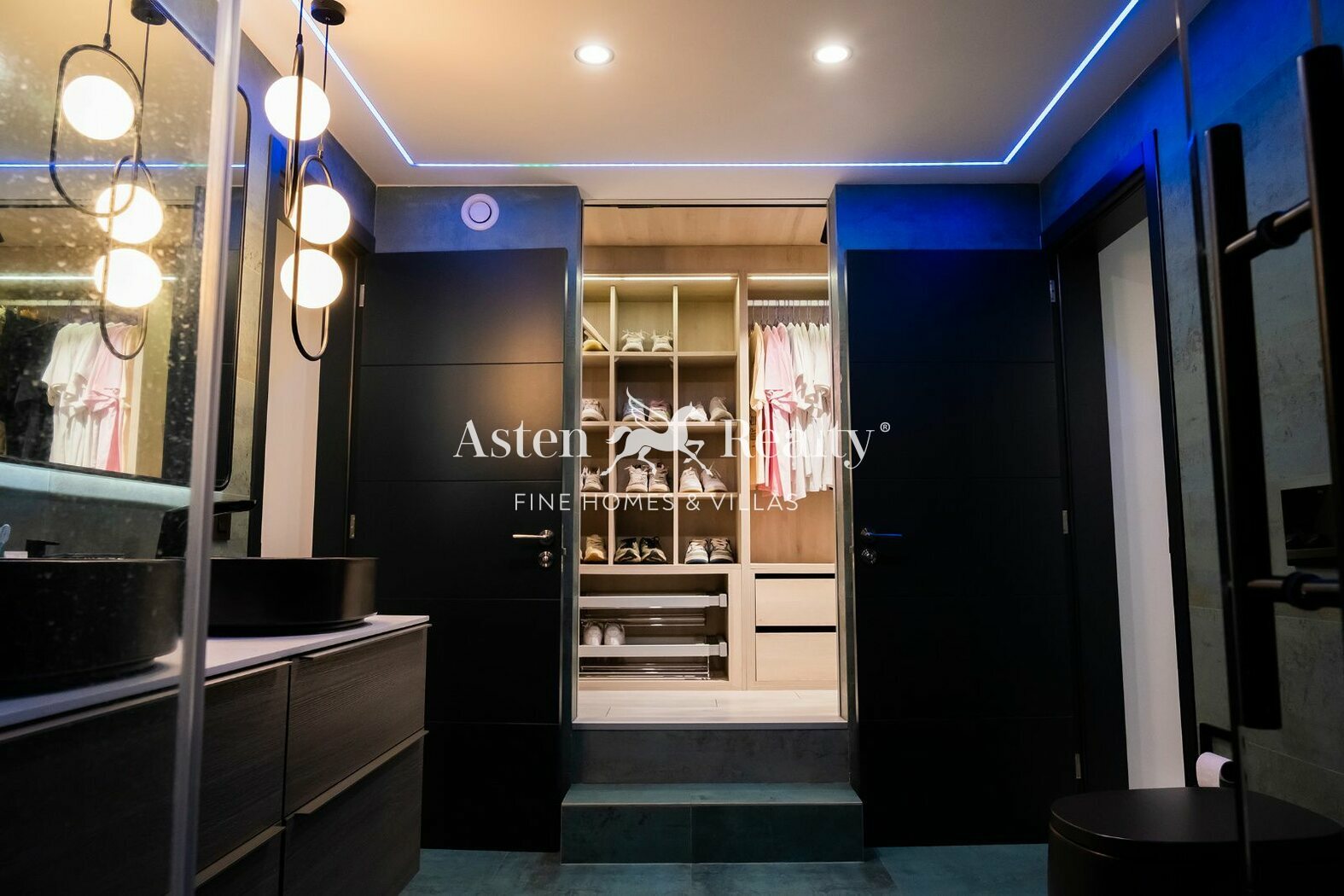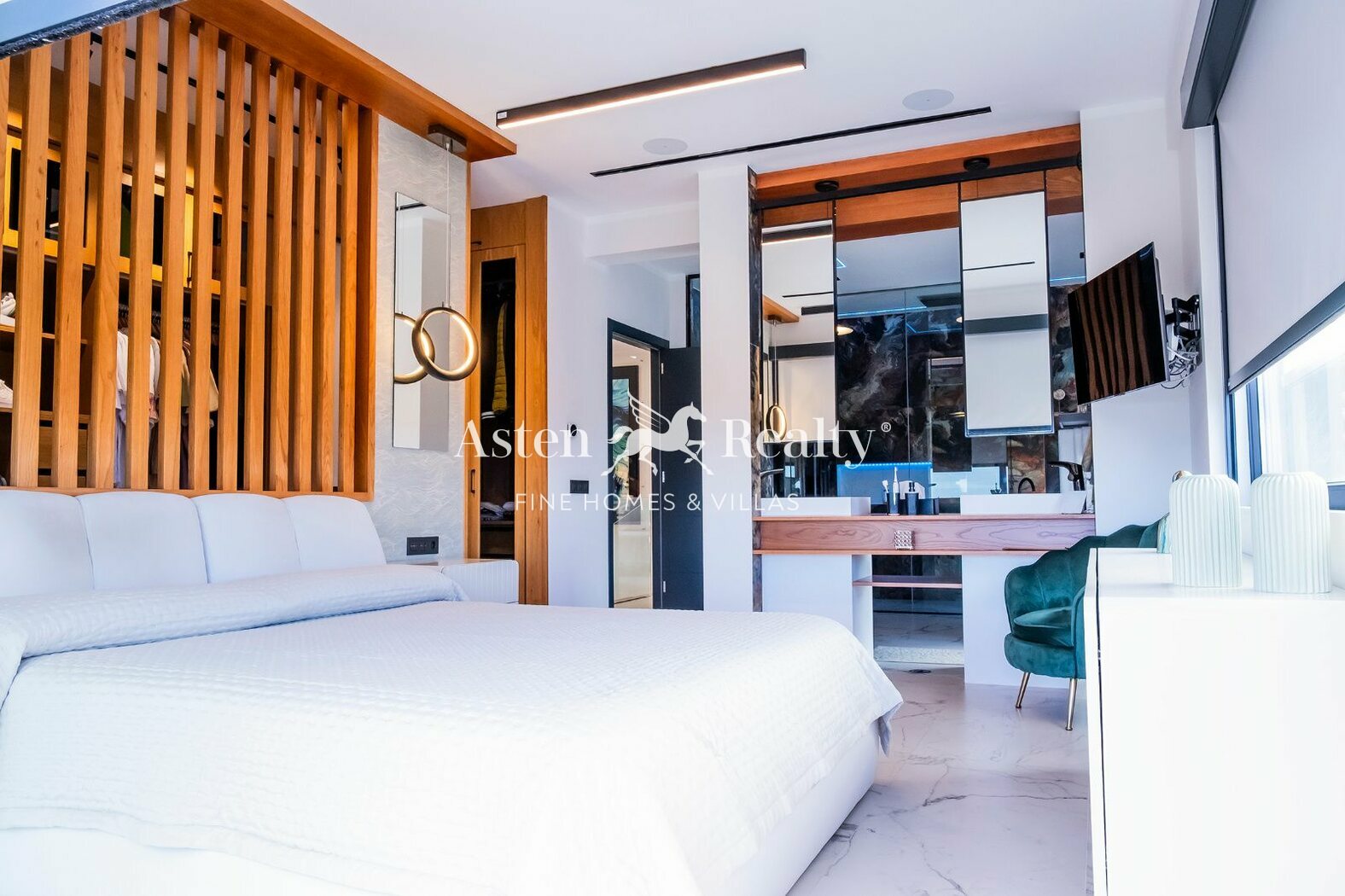 Im Obergeschoss bieten drei Schlafzimmer-Suiten Privatsphäre und Komfort. Jedes verfügt über ein eigenes Bad, einen begehbaren Kleiderschrank und eine Terrasse, von der aus Sie den Sonnenuntergang über dem Ozean betrachten können. Qualität ist in jedem Detail spürbar: großformatige Feinsteinzeugböden, lackierte Tischlerarbeiten, warme Oberflächen und hocheffiziente Isolierung.