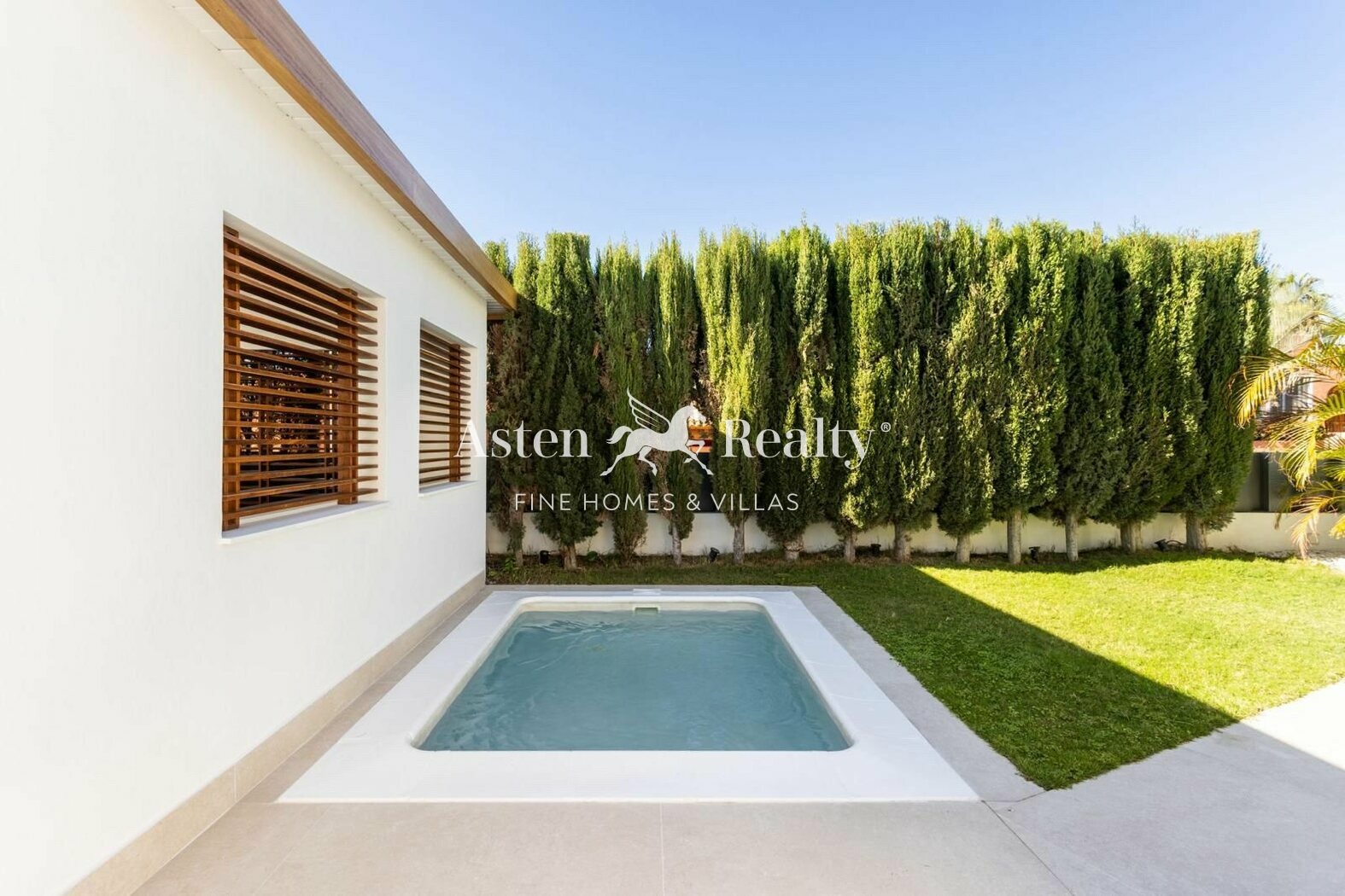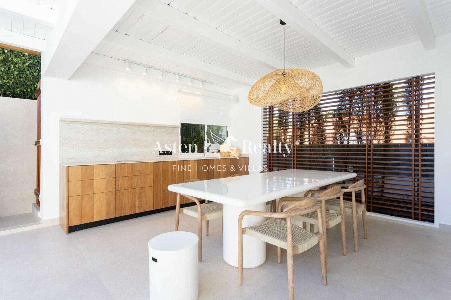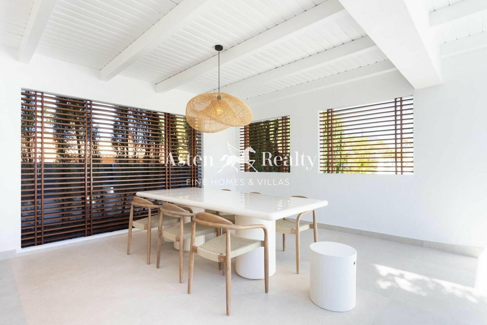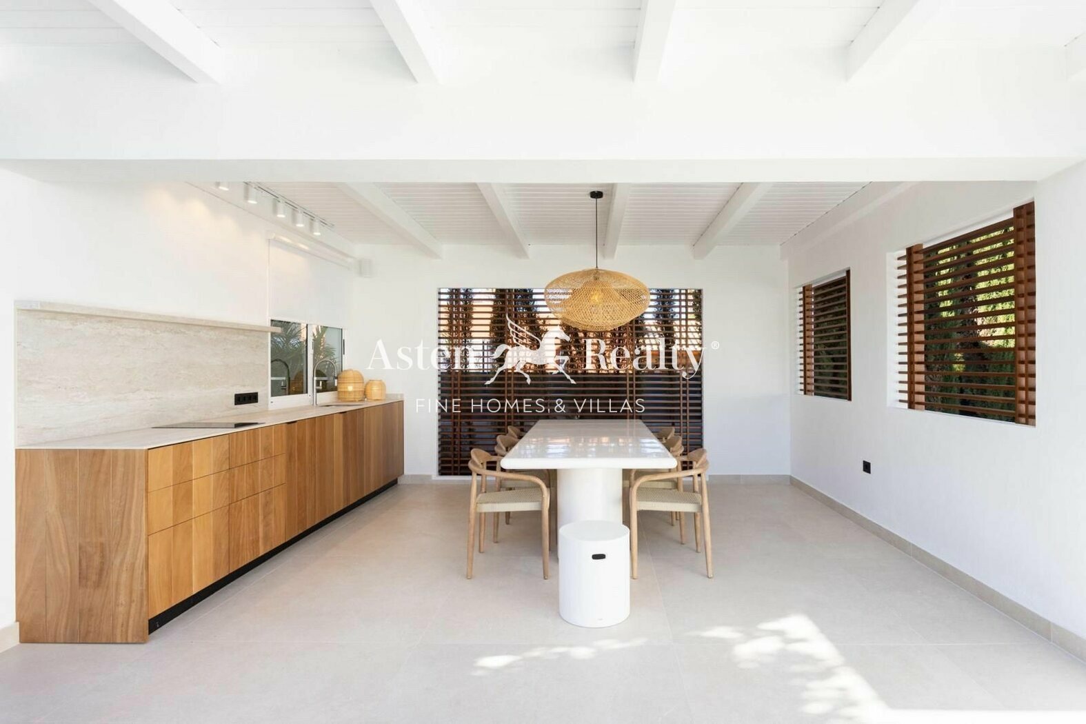 Der Außenbereich wurde als natürliche Erweiterung des Wohnraums konzipiert und umfasst einen eleganten, beheizten Pool mit Gegenstromanlage, der sich sowohl zur Entspannung als auch zum Sport eignet, sowie ein separates Kinderbecken, großzügige Liegeflächen, Gartenbereiche und Räume, die zum Ausruhen und Beisammensein einladen. Die verschiedenen Küchen- und Essbereiche, sowohl im Innen- als auch im Außenbereich, ermöglichen es, den mediterranen Lebensstil in einer exklusiven Umgebung in vollen Zügen zu genießen.