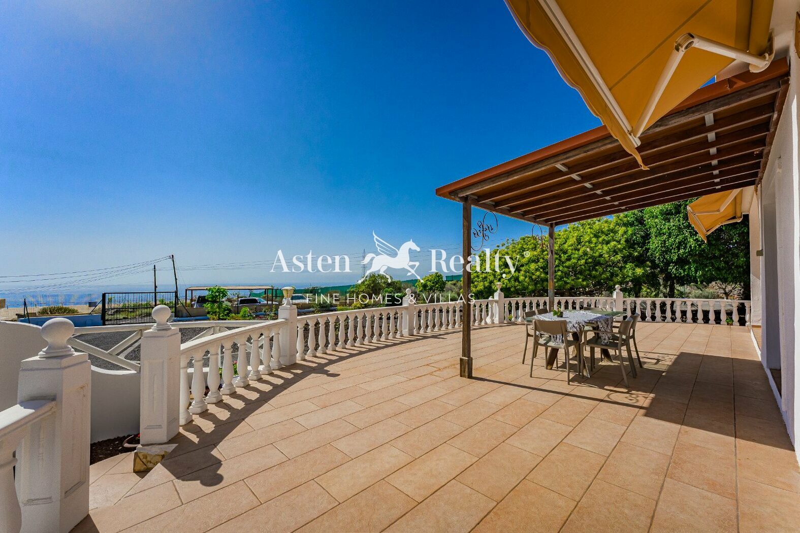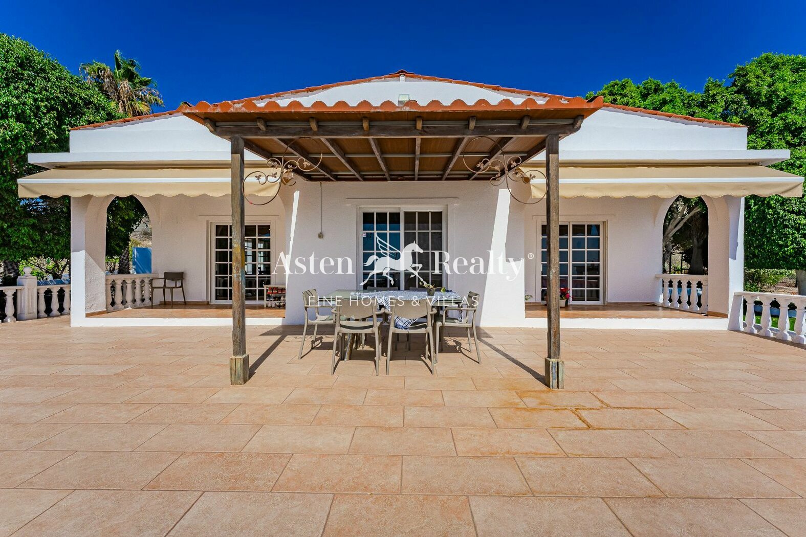 El exterior invita a disfrutar del clima de Tenerife todo el año: jardines cuidados con riego automático, terrazas soleadas frente a la vivienda y otra zona de sombra bajo un gran árbol, algo poco común en la isla. Desde la casa se aprecian vistas al jardín, al mar y a isla vecina — La Gomera.