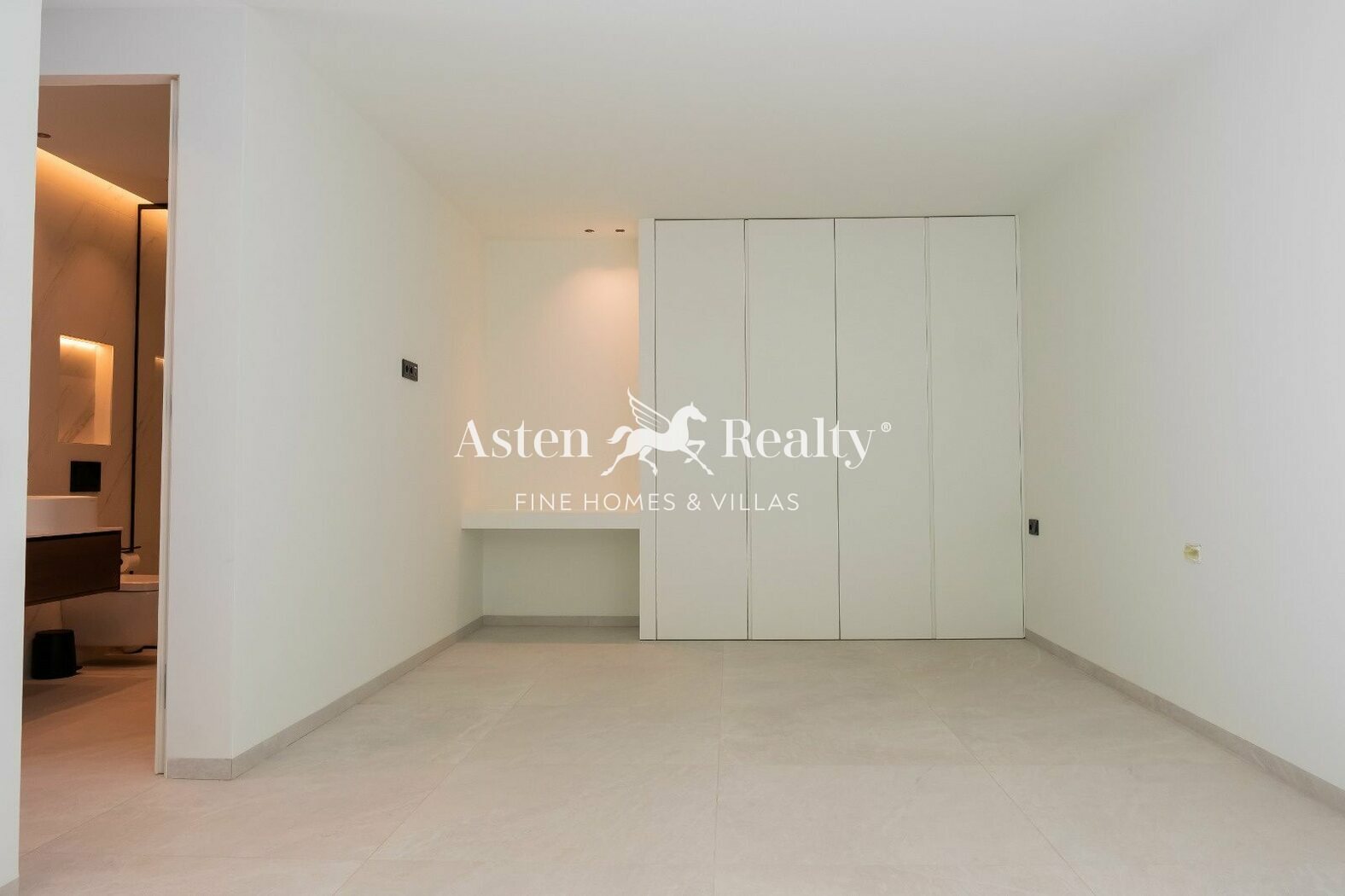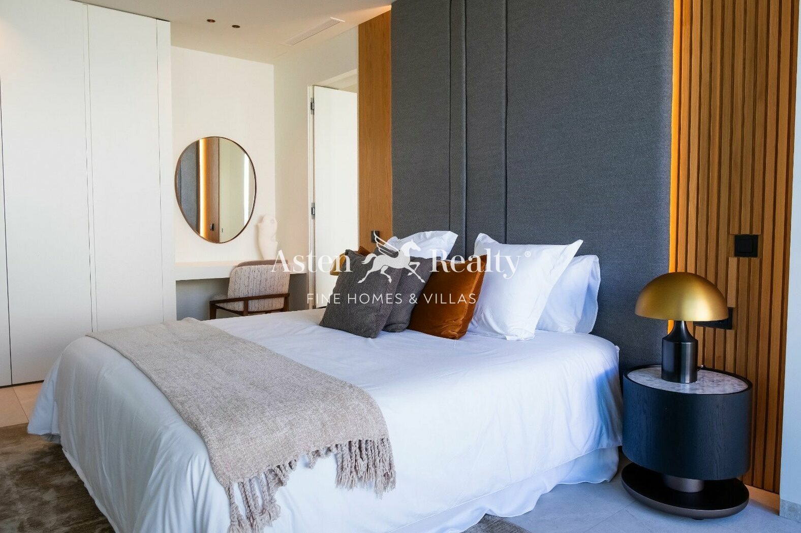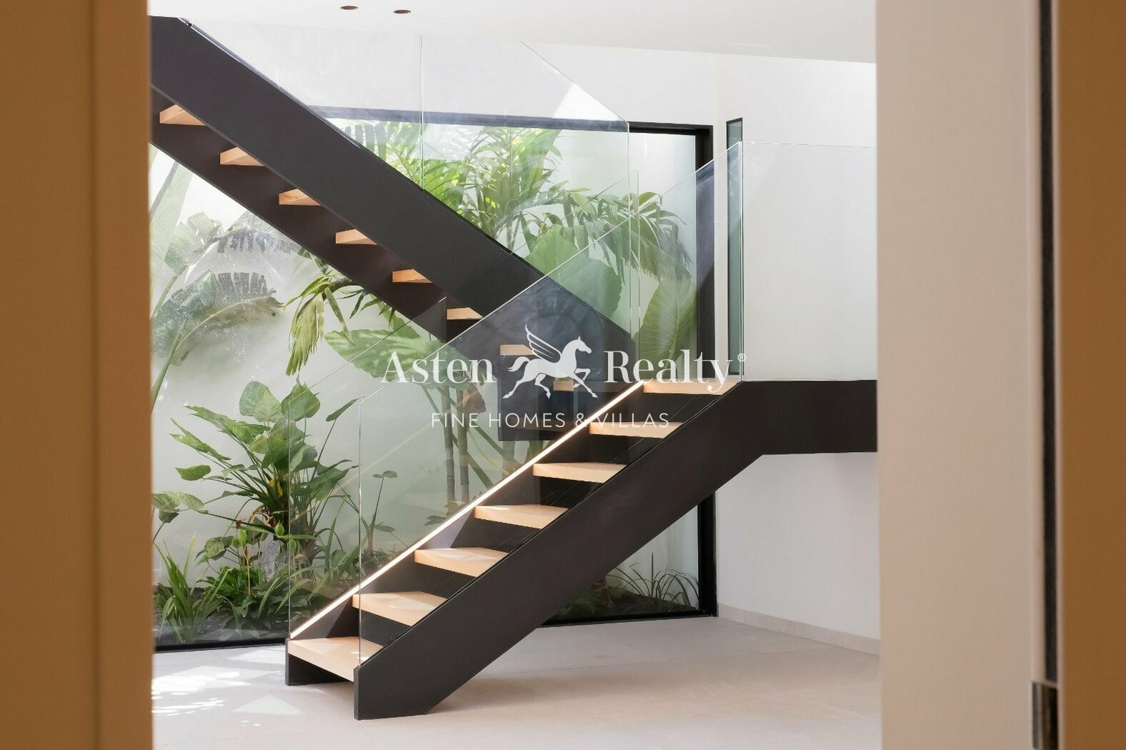 En la planta baja, un elegante vestíbulo da paso a tres amplios dormitorios con vistas al jardín, algunos con bañeras exteriores que evocan la sensación de un spa privado. Una escalera escultórica y un ascensor conectan con la planta superior, donde la luz natural inunda un espacioso salón-comedor que se integra con una cocina de diseño totalmente equipada y una bodega climatizada.