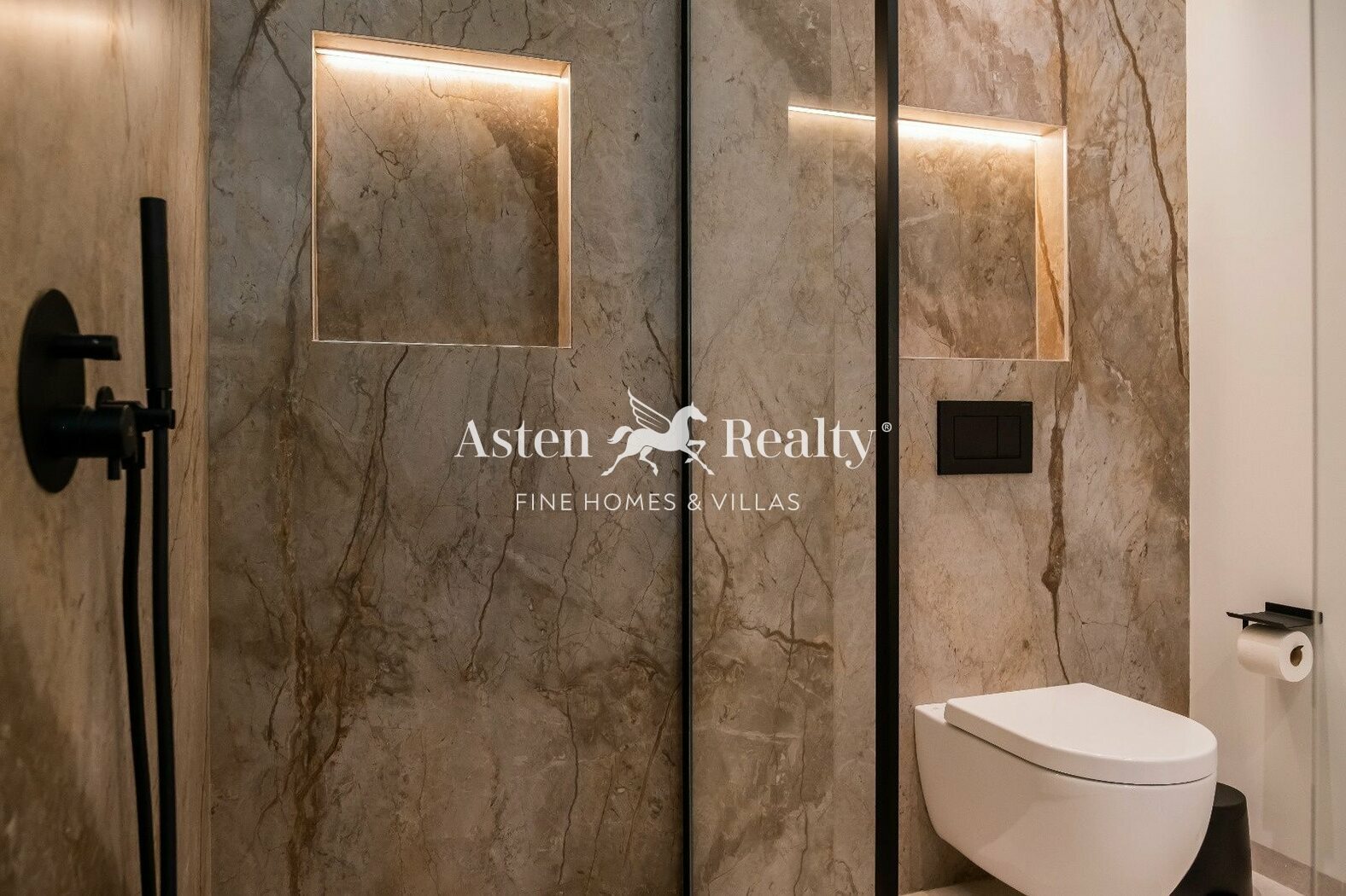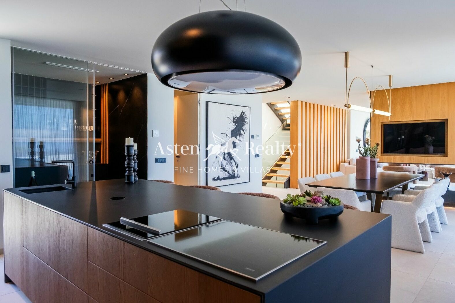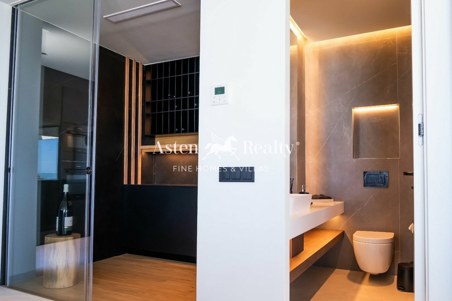 En la planta baja, un elegante vestíbulo da paso a tres amplios dormitorios con vistas al jardín, algunos con bañeras exteriores que evocan la sensación de un spa privado. Una escalera escultórica y un ascensor conectan con la planta superior, donde la luz natural inunda un espacioso salón-comedor que se integra con una cocina de diseño totalmente equipada y una bodega climatizada.