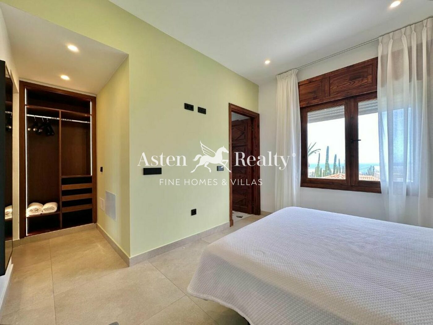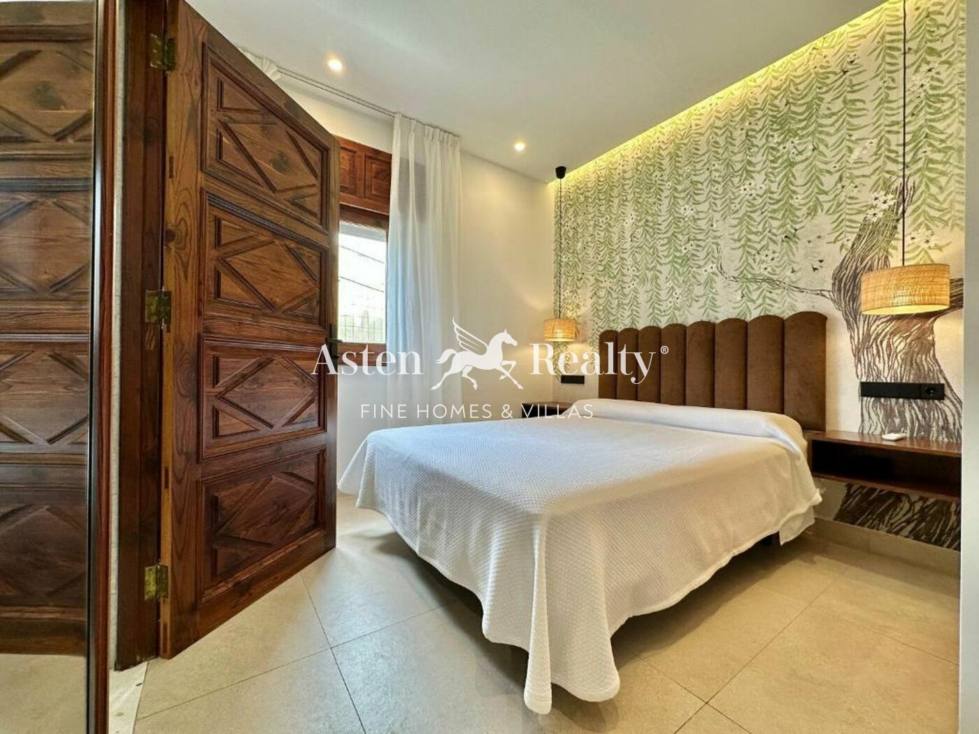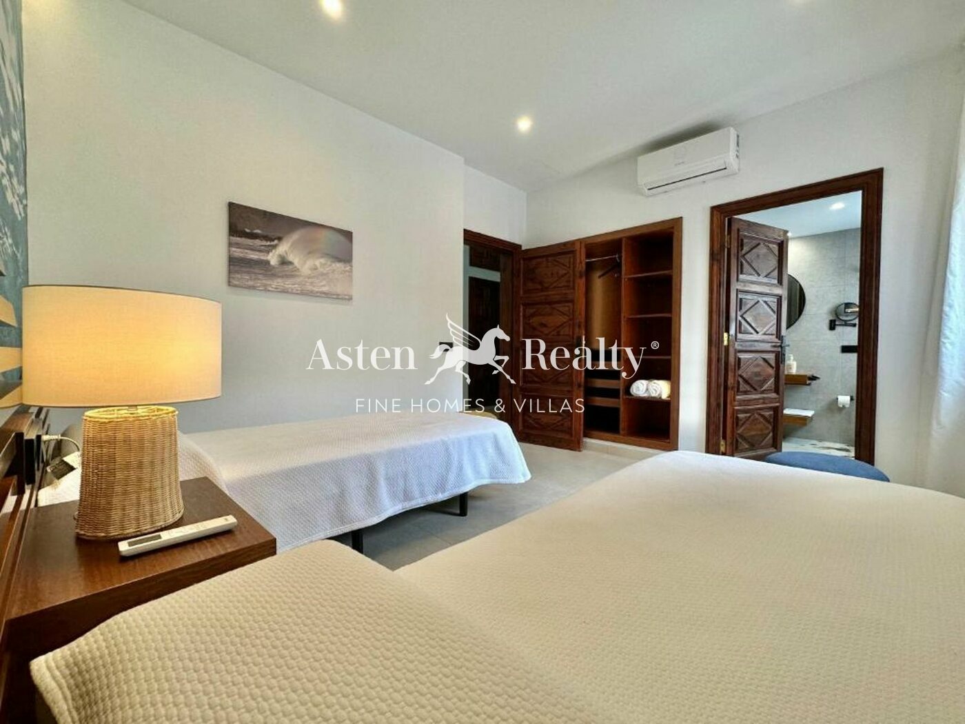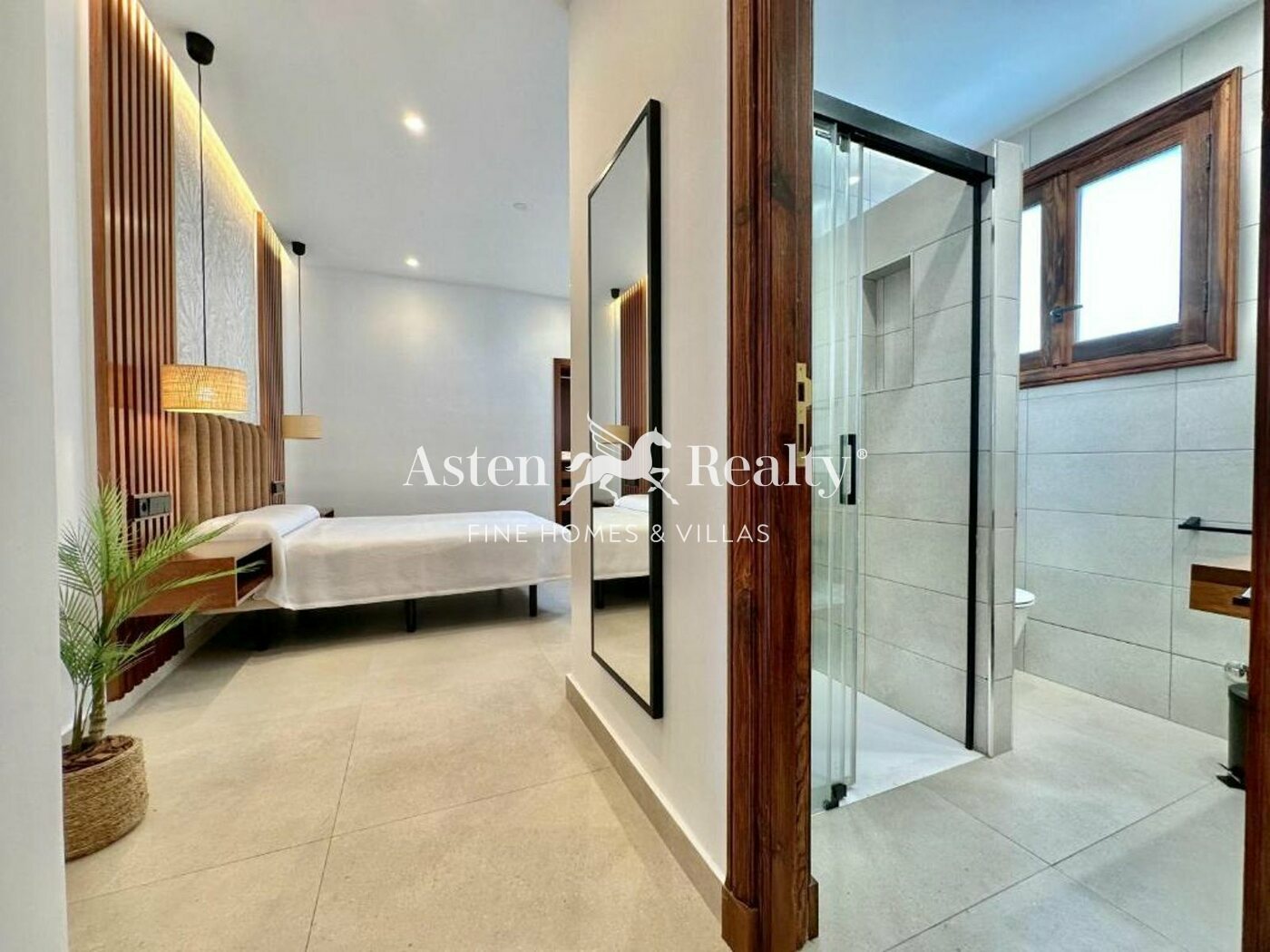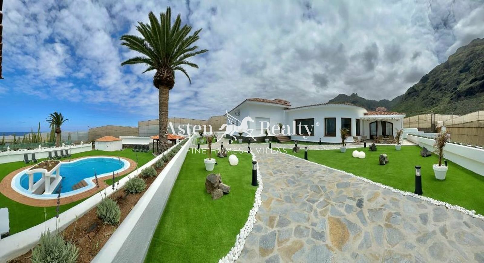 La villa principal, una antigua casa canaria con carácter, ha sido totalmente reformada respetando su encanto original. Dispone de 5 dormitorios dobles con 5 baños, un amplio salón principal con comedor, una espectacular cocina completamente equipada y un segundo salón con salida directa a una terraza exterior techada, desde donde se disfrutan magníficas vistas al mar.