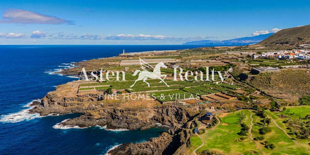 Une propriété exceptionnelle face à l’océan dans le nord-ouest de Tenerife, perchée sur des falaises avec une vue imprenable sur le majestueux Teide, entourée de plantations de bananiers et de terrains de golf.