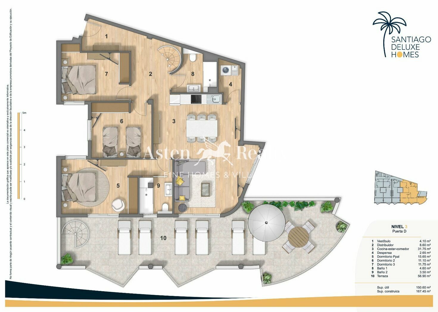 Penthouse 3/4 D étage, 4 chambres, 3 salles de bains, 254,55 m2 total avec 102,05 m2 de terrasses, PRIX €1.150.000
