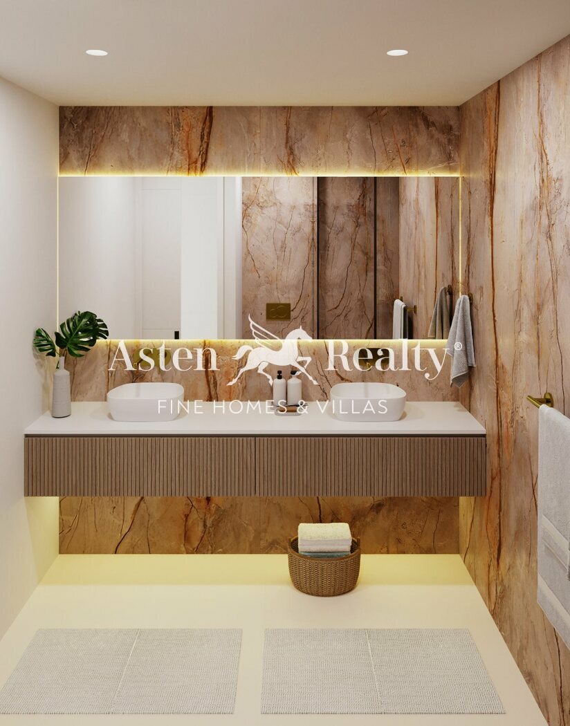 All’interno, il design contemporaneo e i materiali di prima qualità creano un’atmosfera serena e sofisticata. La cucina a pianta aperta e il soggiorno si estendono senza soluzione di continuità nel giardino attraverso ampie finestre, creando un flusso perfetto tra interno ed esterno. La camera da letto invita al relax e il bagno, con le sue eleganti finiture, porta un tocco di hotel boutique nella vita quotidiana.