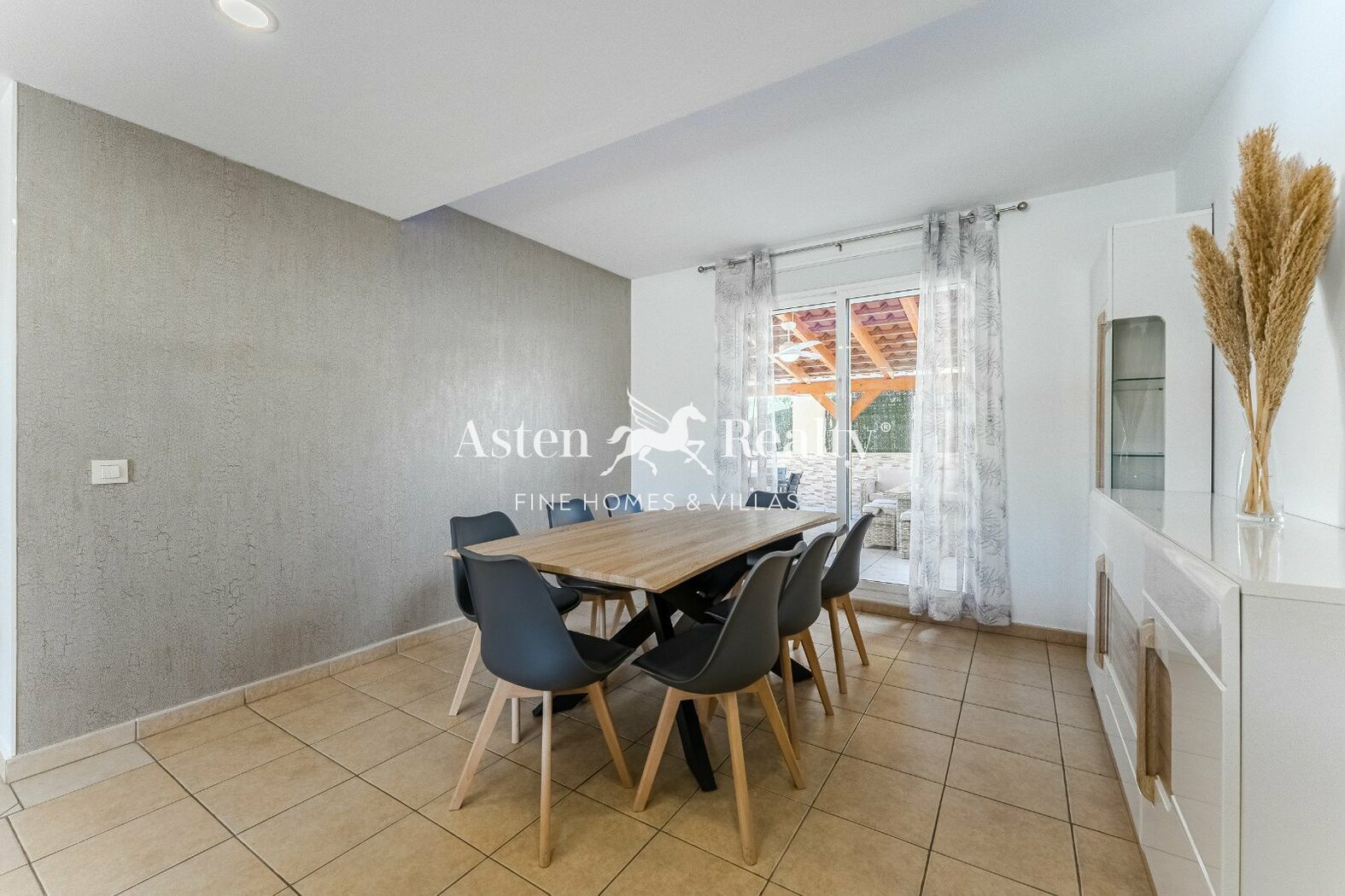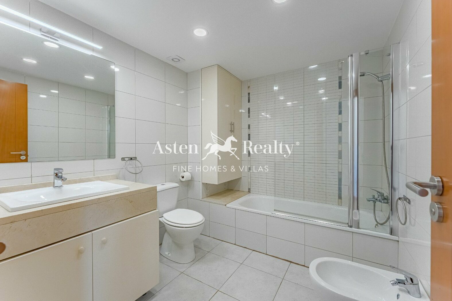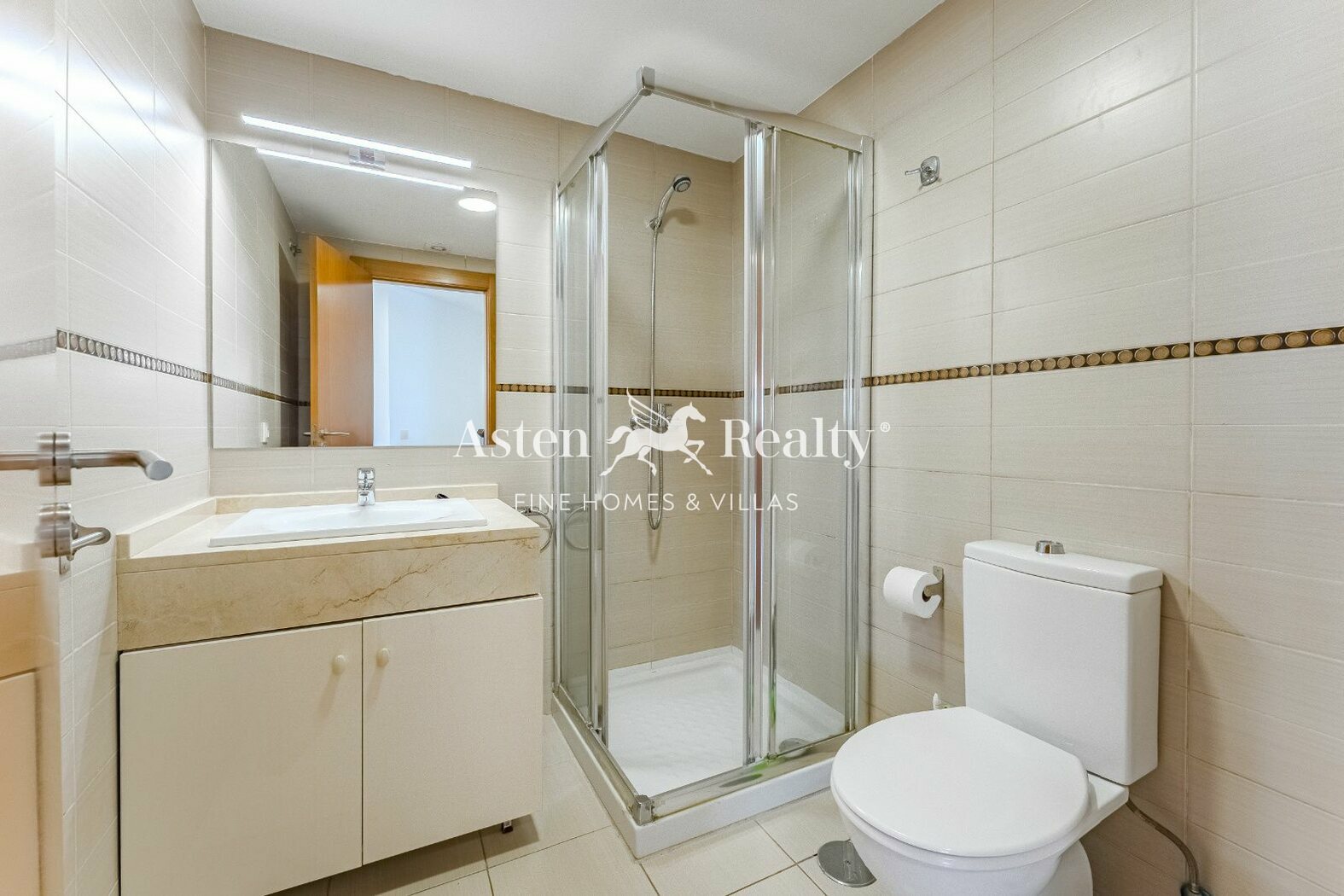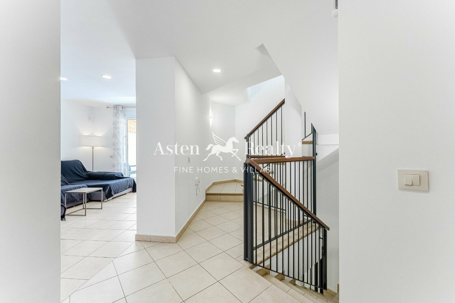 Al piano principale, il soggiorno open space collega a una seconda terrazza sul retro, anch’essa coperta, con accesso diretto alle aree comuni con piscine e giardini. La cucina è indipendente, dotata di elettrodomestici nuovi, e dispone di una lavanderia.