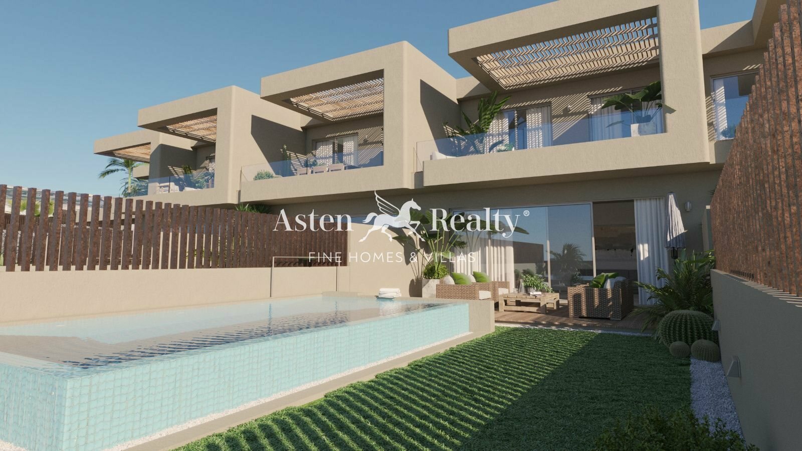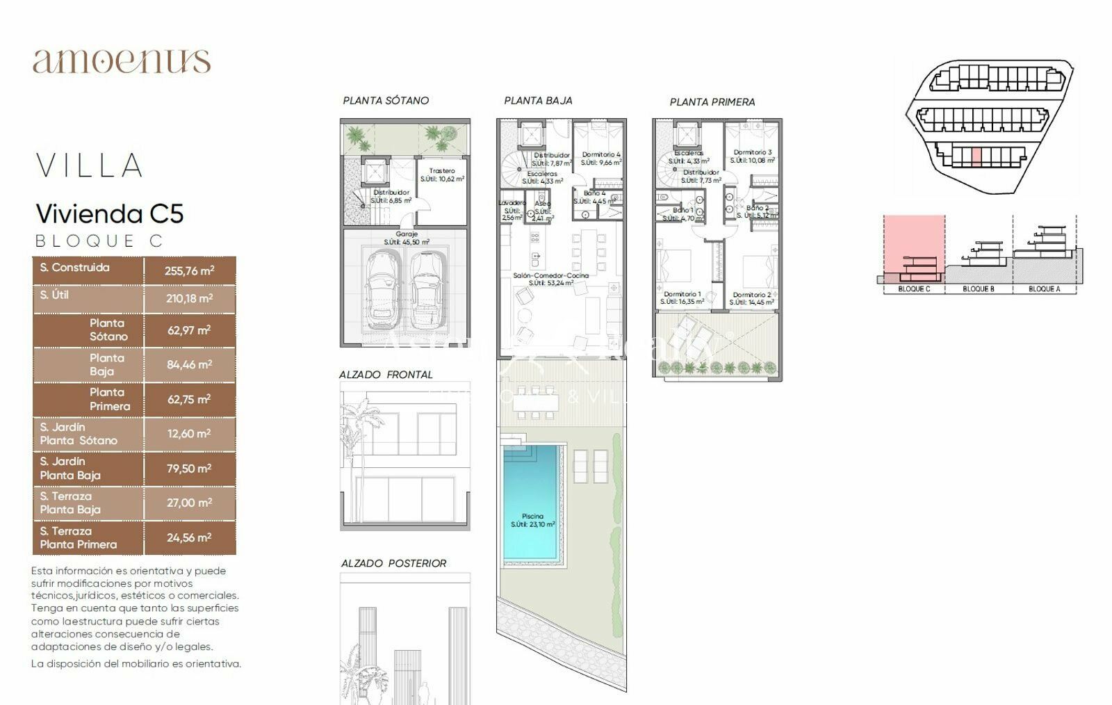 Sono distribuite nella fila C e la zona giorno, con una grande piscina a sfioro di acqua salata, giardino e un’ampia terrazza, si trova al piano terra, così che tutte godono di una splendida vista frontale, vicina e aperta sul mare.