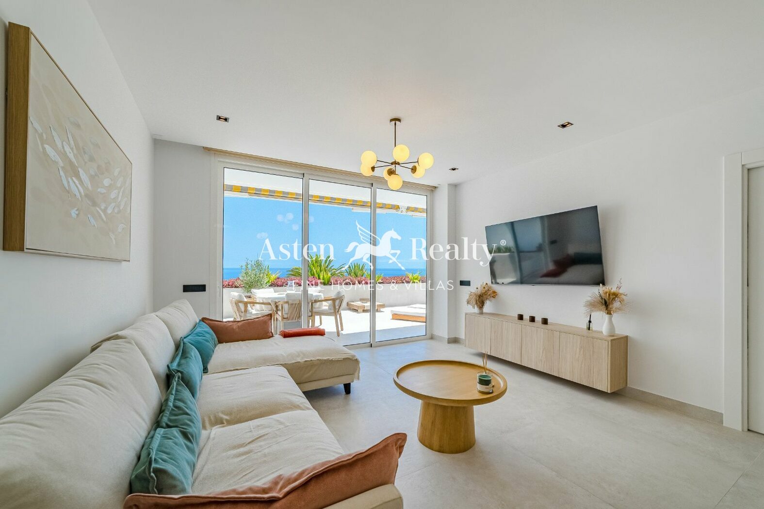 Het privéterras is de perfecte plek om te genieten van het adembenemende panoramische uitzicht op zee, terwijl het gemeenschappelijk zwembad uitnodigt tot ontspanning in een bijzondere omgeving.