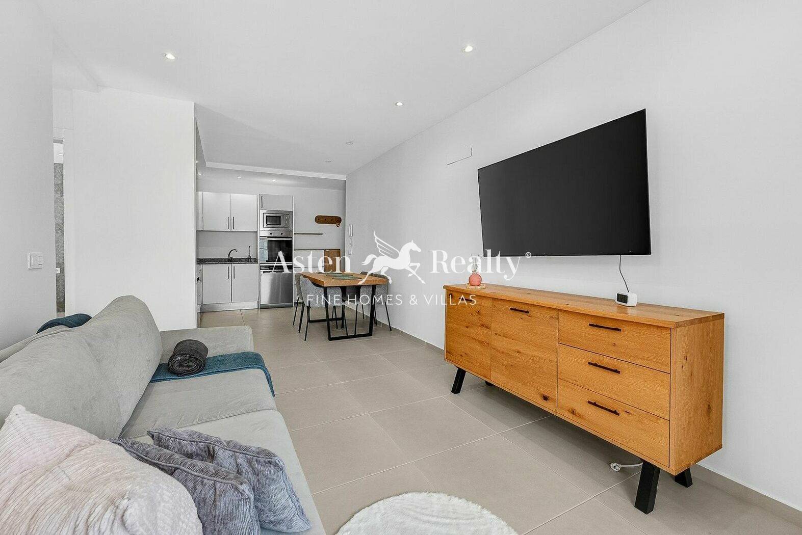 The living room with open-plan kitchen creates a fluid living area that naturally extends towards the balcony. A space to start the day calmly and end it with ever-present views. Two bedrooms, one main bedroom and a smaller one that can be used as a children’s room or office.