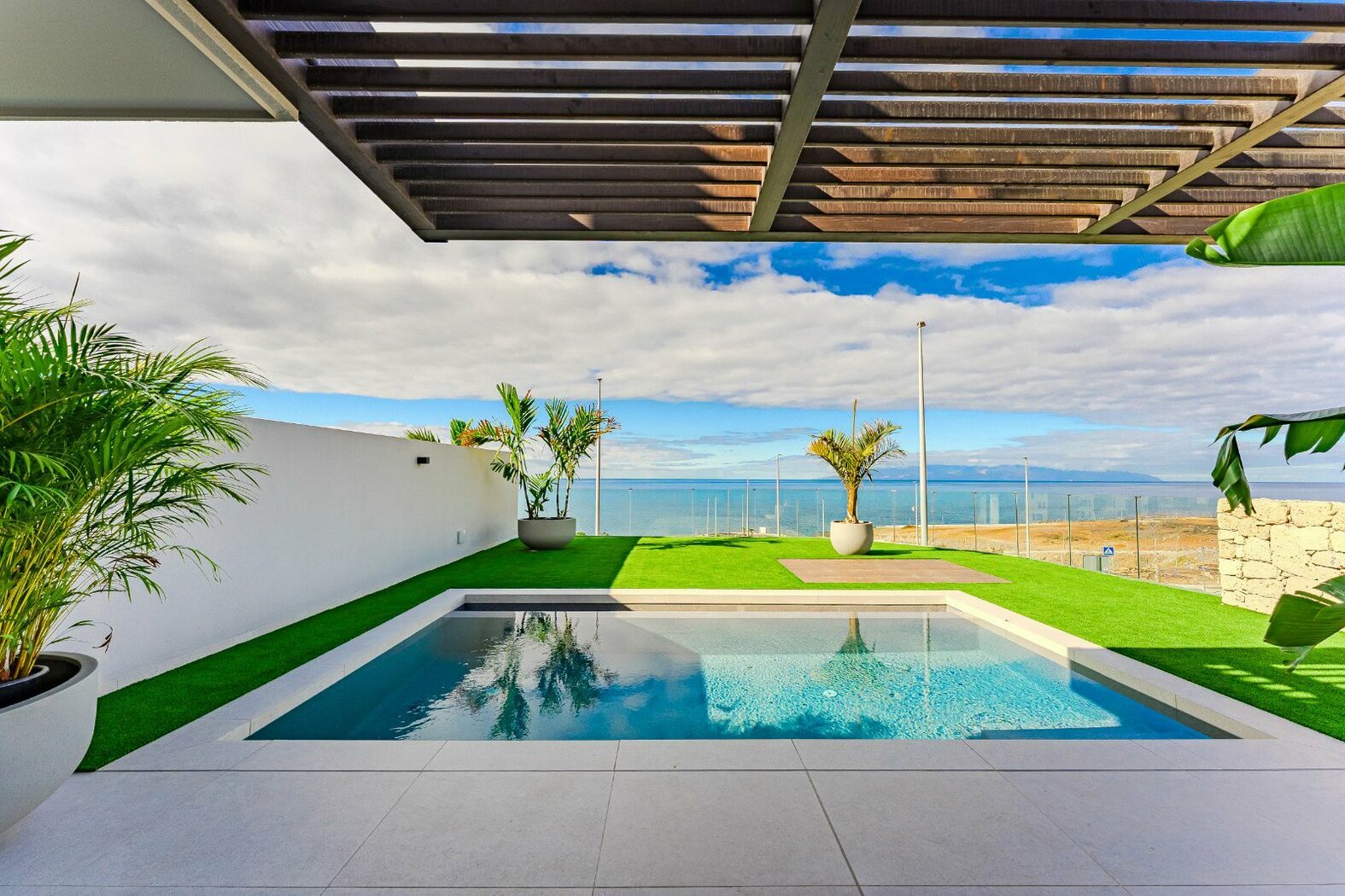 Luxury bungalow in a spectacular beachfront location in Costa Adeje! The bungalow is designed to maximize sunshine from the terrace throughout the day, offering stunning views of the beach and sea. It features three bedrooms, four bathrooms, a living-dining room, a fully equipped kitchen with an island, and a front terrace with a private pool. High-quality, contemporary materials are used throughout.