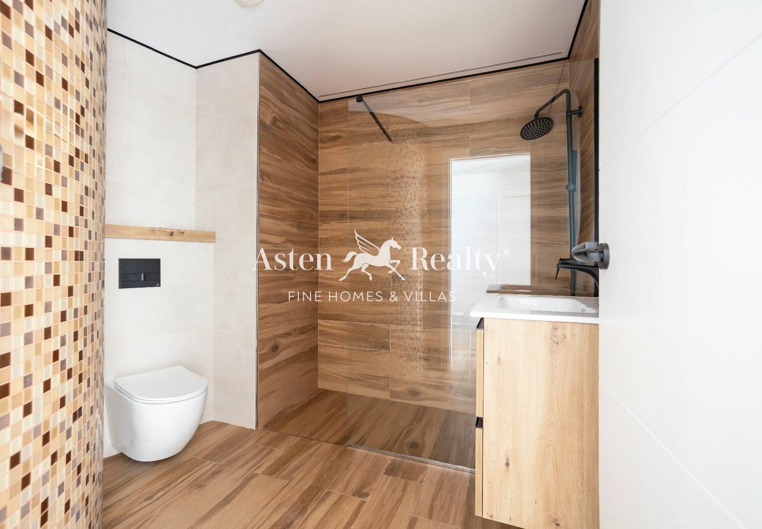 - Suspended wooden furniture with white ceramic sinks in bathrooms.