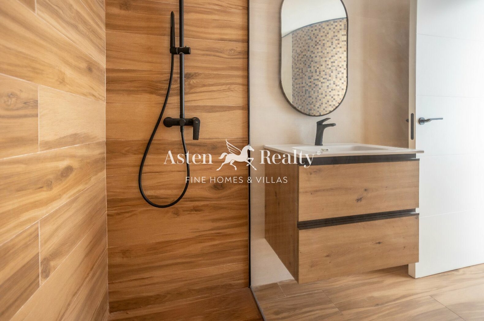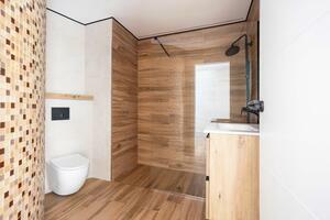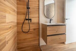 - “In situ” shower trays recessed at floor level with linear stainless steel drain, imitation wood finish, the same as the interior flooring of the home in the formation of side walls and flooring.