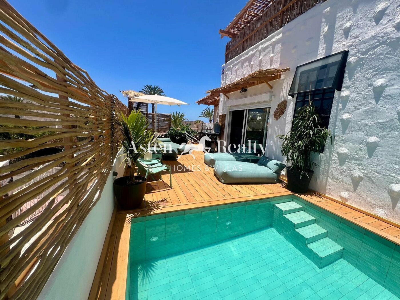 The second, larger home, has 111 m2 built. It features a large living room with an open kitchen and direct sea views, three double bedrooms with private bathrooms, a gym area, and a charming outdoor patio with a private pool. It also includes a covered dining area under a wooden pergola, ideal for enjoying Tenerife’s climate year-round.