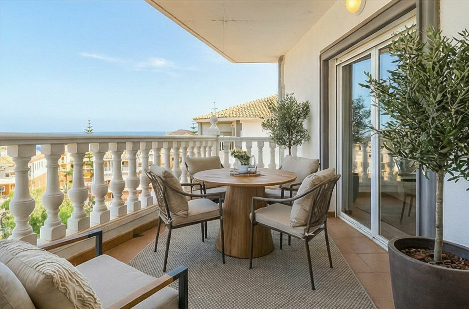 The property has three bedrooms: two of them are quite spacious and the third one is smaller, ideal as an office, dressing room or single room. All of them have built-in wardrobes and exterior windows, providing plenty of light throughout the day. The master bedroom has an en-suite bathroom with bathtub and direct access to a pleasant back terrace with unobstructed sea views.