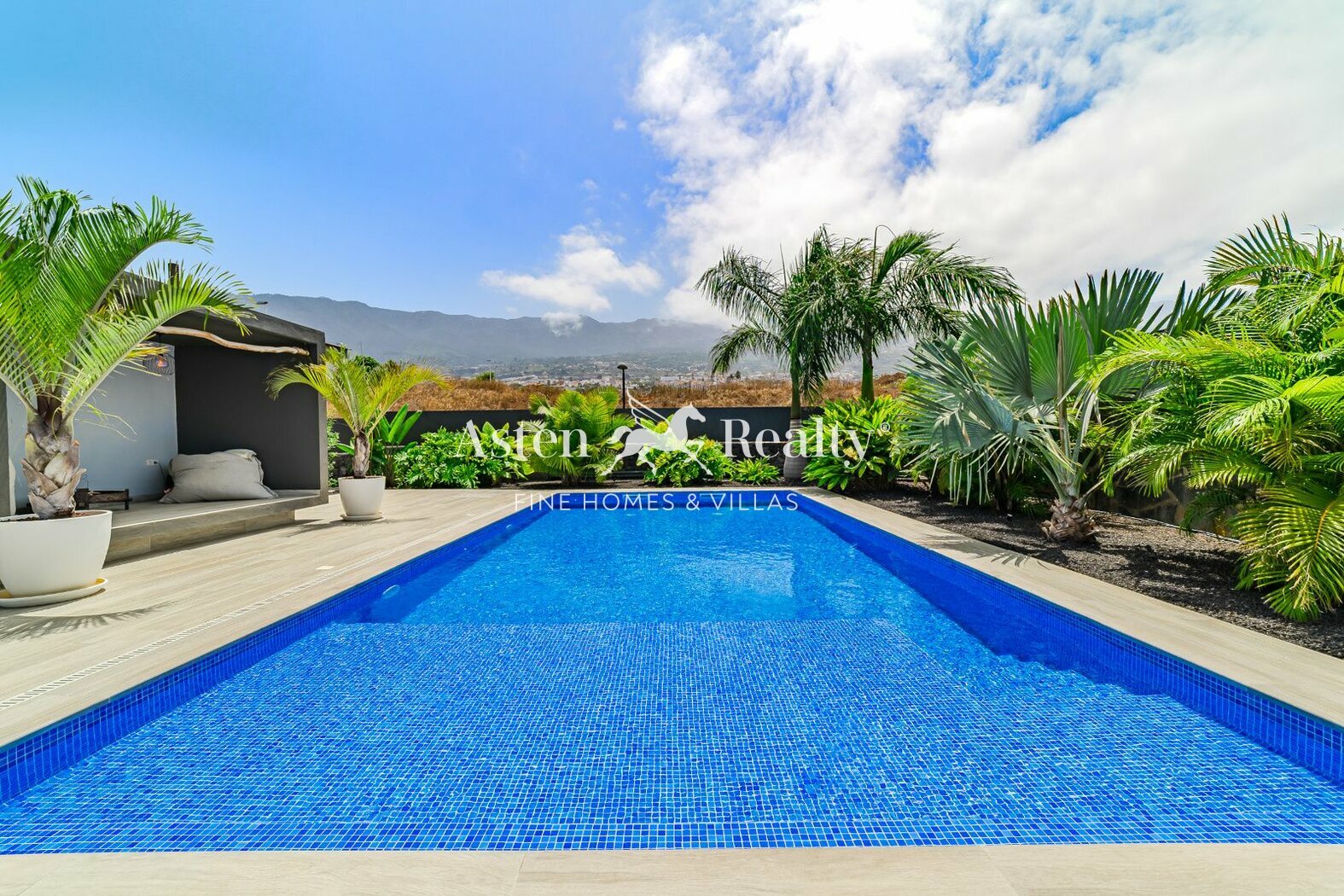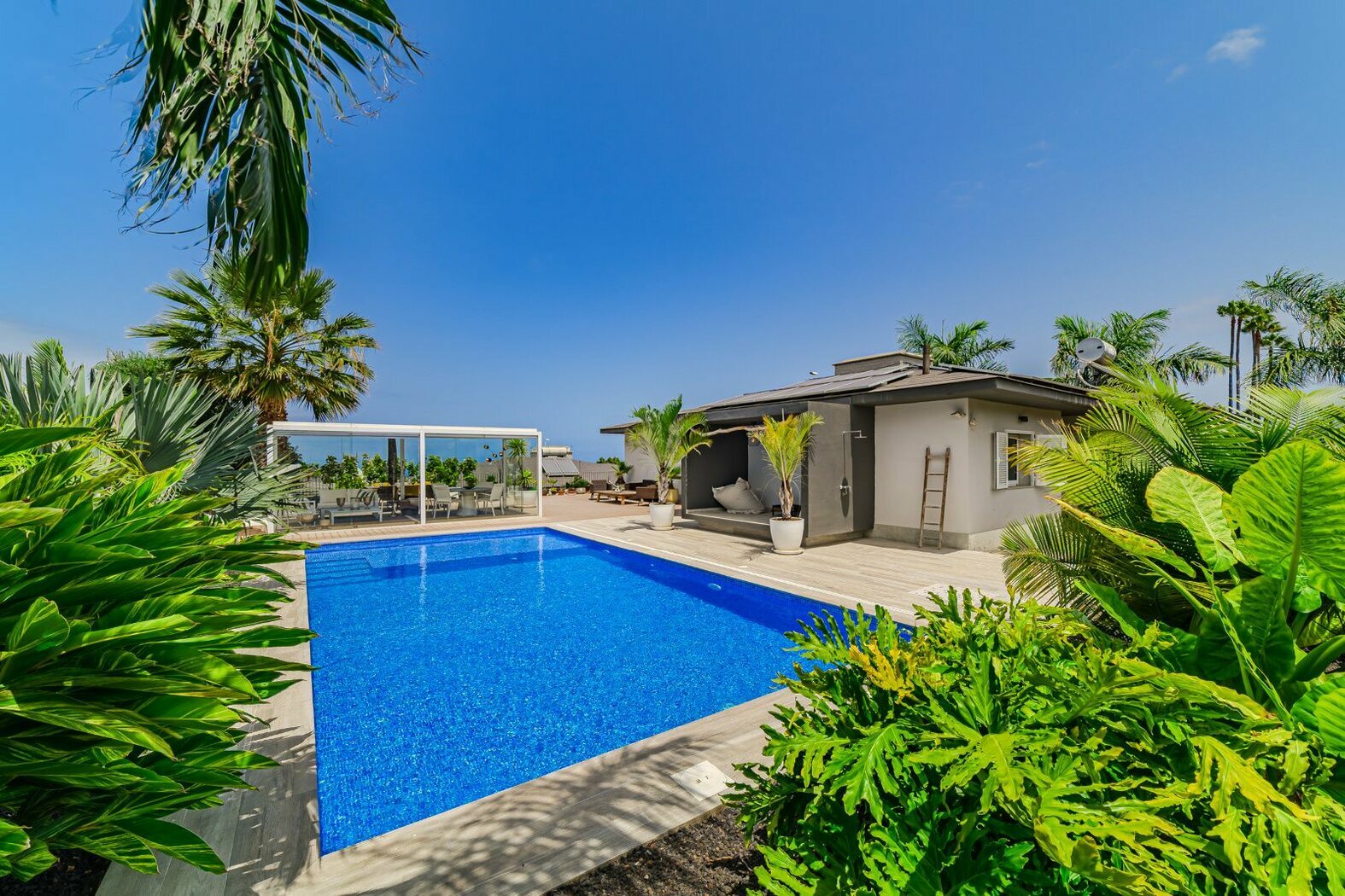 The outdoor area is a true retreat. A landscaped palm garden surrounds the pool, which was newly built and illuminated in 2024. With generous dimensions of 5 × 10 meters and heated by a modern heat pump, it can be enjoyed all year round.
