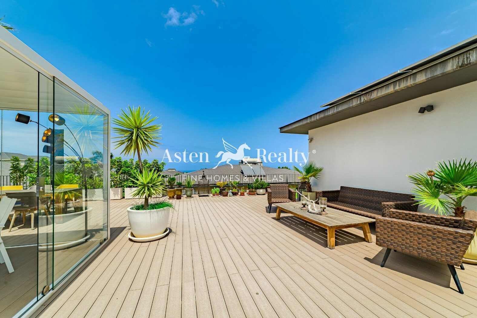 The spacious terrace with its elegant glass pergola, chill-out lounge, and various seating areas invites you to relax or spend time with family and friends. The large garage accommodates up to three vehicles and includes an EV charging station, practical and sustainable.