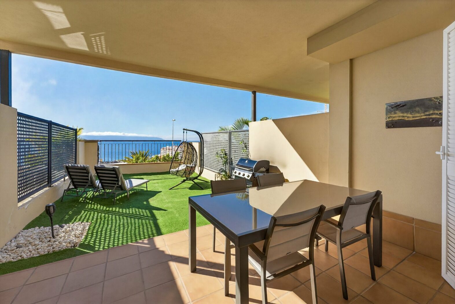 On the main floor, we enter a spacious living-dining room with access to the 19 m² garden with panoramic views of the sea and the neighbouring island of La Gomera with its magnificent sunsets; a brand new separate kitchen with high-end appliances and a toilet.