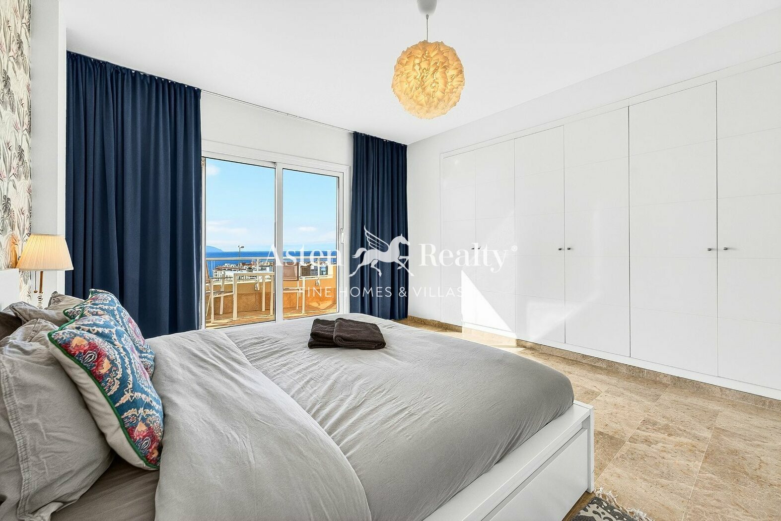 A comfortable staircase leads to the upper floor, where there are two bedrooms with fitted wardrobes and two full bathrooms with bathtubs. One of the bedrooms is the master bedroom with an en-suite bathroom and a balcony with stunning ocean views.