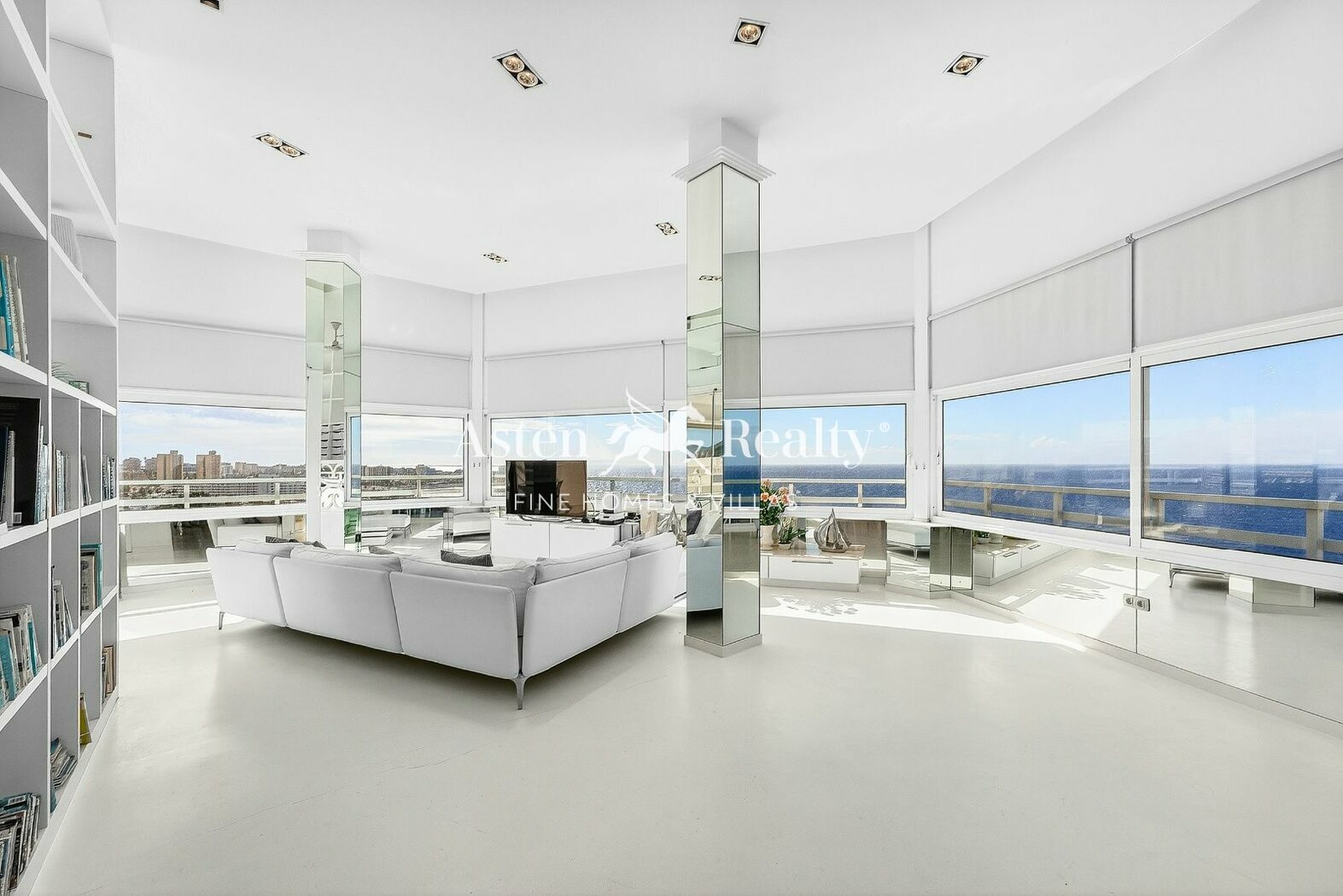 The interior has been designed in a contemporary style using high-quality materials. It features a spacious open-plan living and dining area, a fully equipped designer kitchen, an elegant office space with direct sea views, a master suite with a spa-style bathroom and walk-in wardrobe, as well as an upper level with a private gym and generous storage areas. The interior is complemented by an elegant built-in library, seamlessly integrated into the living area. The layout can easily be adapted into two or three bedrooms if desired.