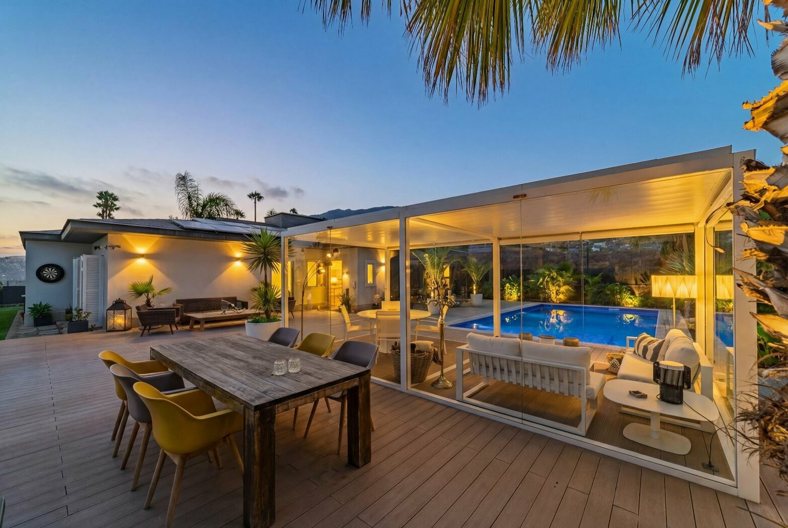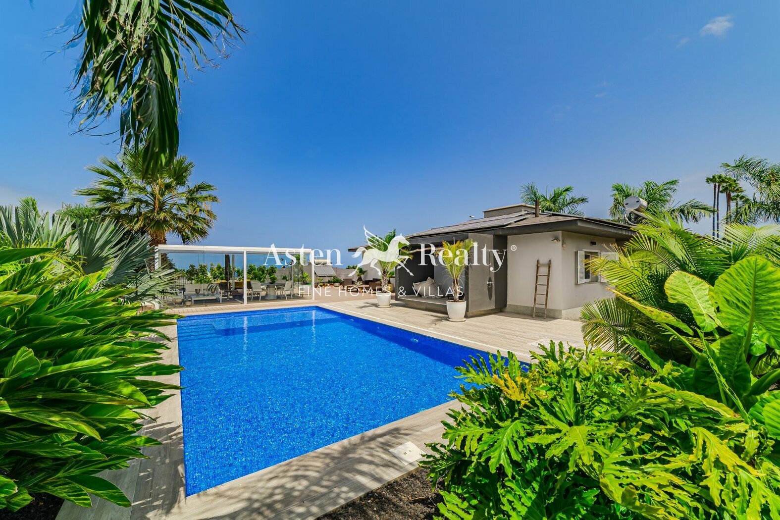 The outdoor area is a true retreat. A landscaped palm garden surrounds the pool, which was newly built and illuminated in 2024. With generous dimensions of 5 × 10 meters and heated by a modern heat pump, it can be enjoyed all year round.