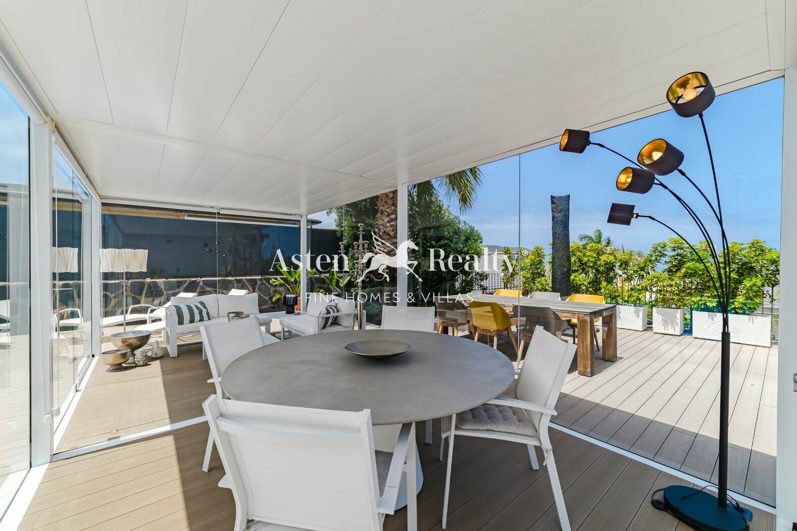 The spacious terrace with its elegant glass pergola, chill-out lounge, and various seating areas invites you to relax or spend time with family and friends. The large garage accommodates up to three vehicles and includes an EV charging station, practical and sustainable.