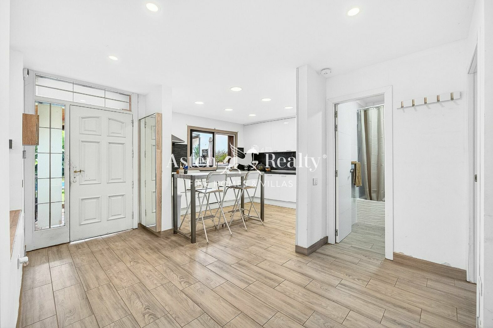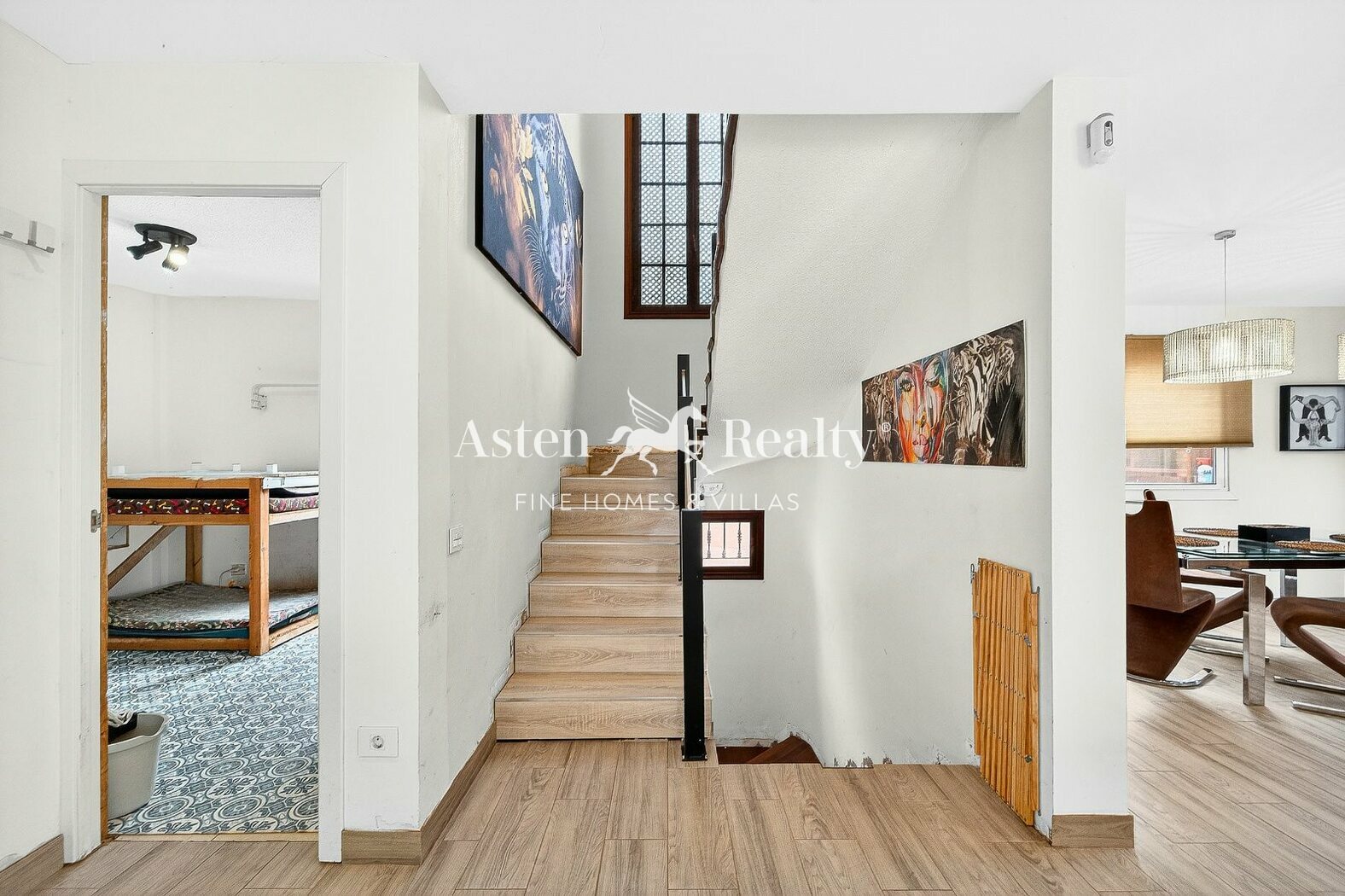 The house is distributed over several levels, offering a comfortable and versatile layout. On the main floor there is a completely modernised kitchen integrated with the living room, creating a bright and open space. Part of the interior walls were removed to provide a more spacious and contemporary feel, allowing natural light to flow throughout the living area. On this same floor there is also a guest bathroom and a separate room with access to the rear terrace.