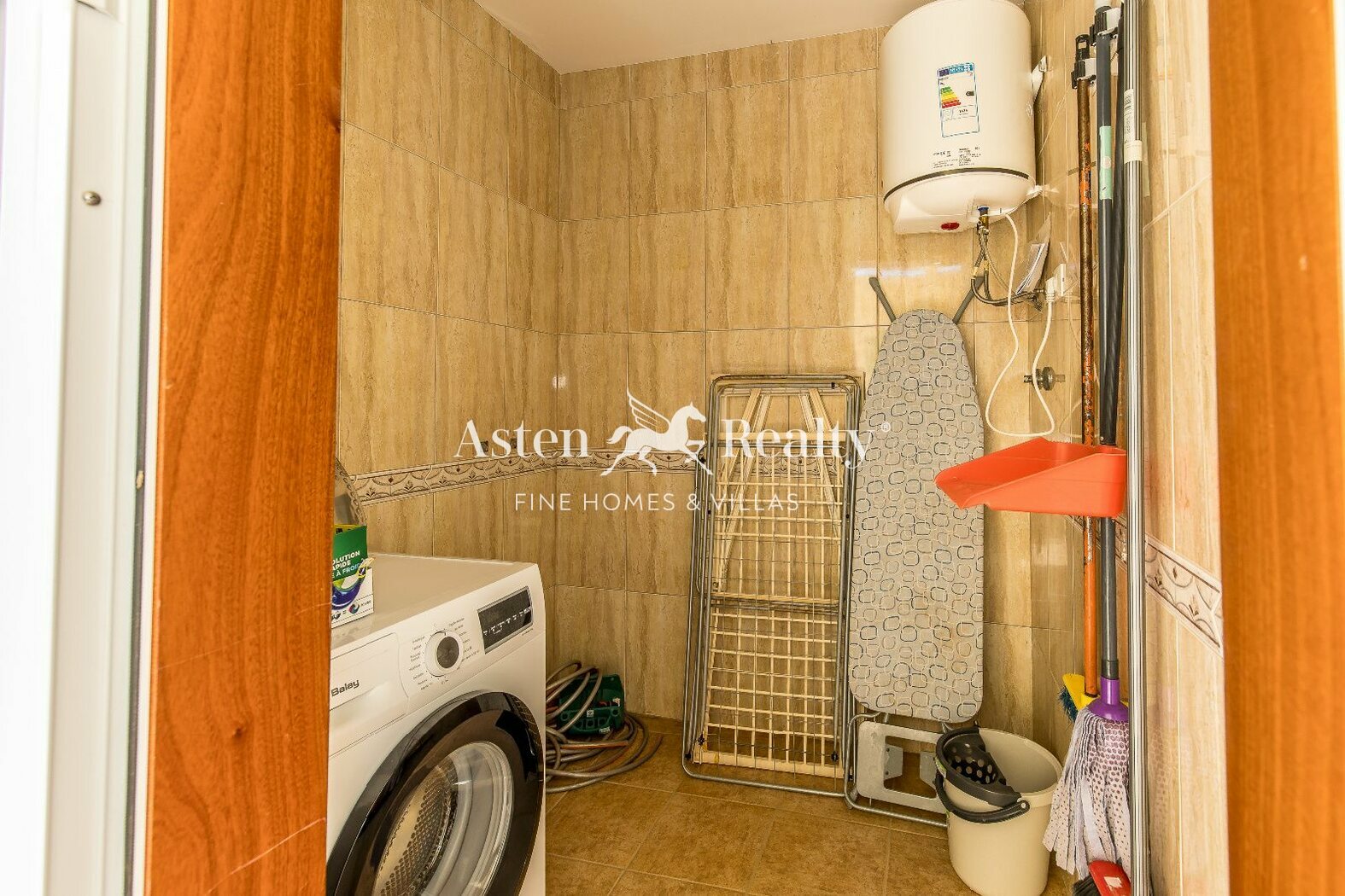 The property offers a practical layout, with two bedrooms featuring ample wardrobe space, designed with everyday living in mind. From inside, a staircase leads to the spacious 43 m2 private roof terrace, a versatile space where you can create a relaxation area, an outdoor dining area or a sun deck. On this top floor there is also a separate laundry room, providing additional practicality.