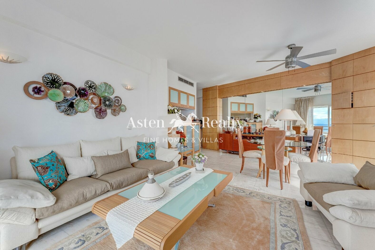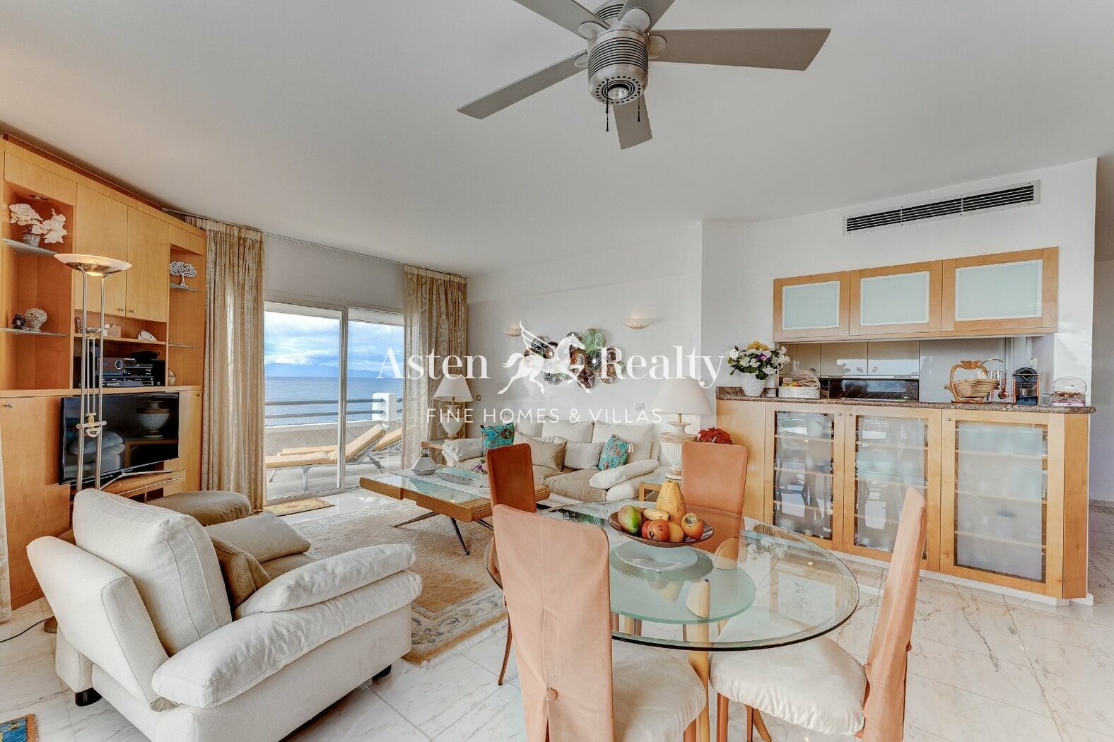 Интерьер квартиры площадью 80 m² отличается светлой и уютной атмосферой. Планировка включает гостиную-столовую с открытой кухней, две спальни с прямым выходом на террасу (одна из них с ванной комнатой) и вторую ванную комнату. Каждый уголок был спроектирован так, чтобы максимально использовать естественное освещение и открывающиеся виды.