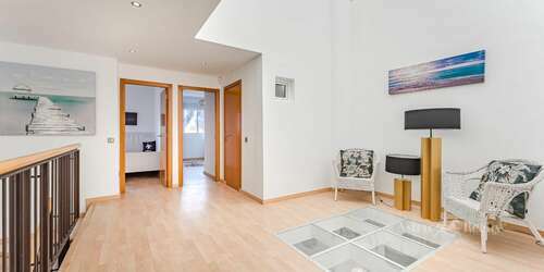 На втором этаже расположены 3 спальни со встроенными шкафами, две ванные комнаты, одна из которых с ванной. Есть впечатляющий световой люк с электрическим навесом, где находится лестница, ведущая на меблированную террасу на крыше дома, откуда можно наслаждаться джакузи, созерцая небо и море.