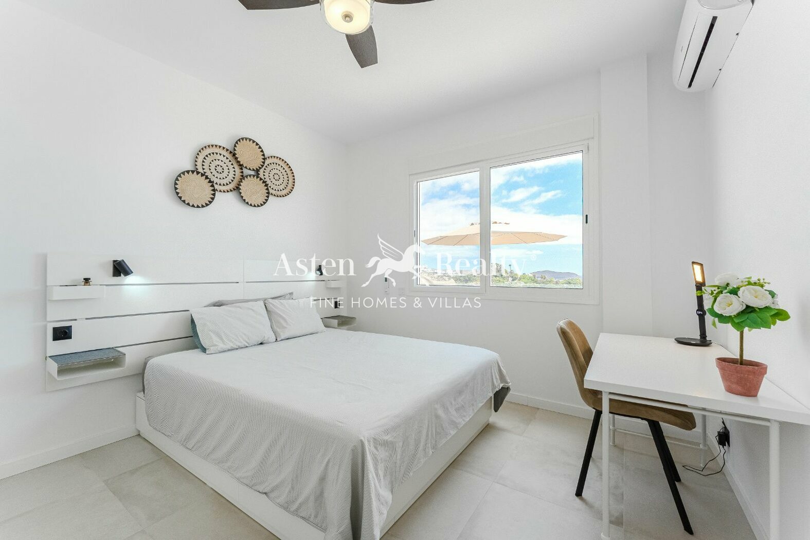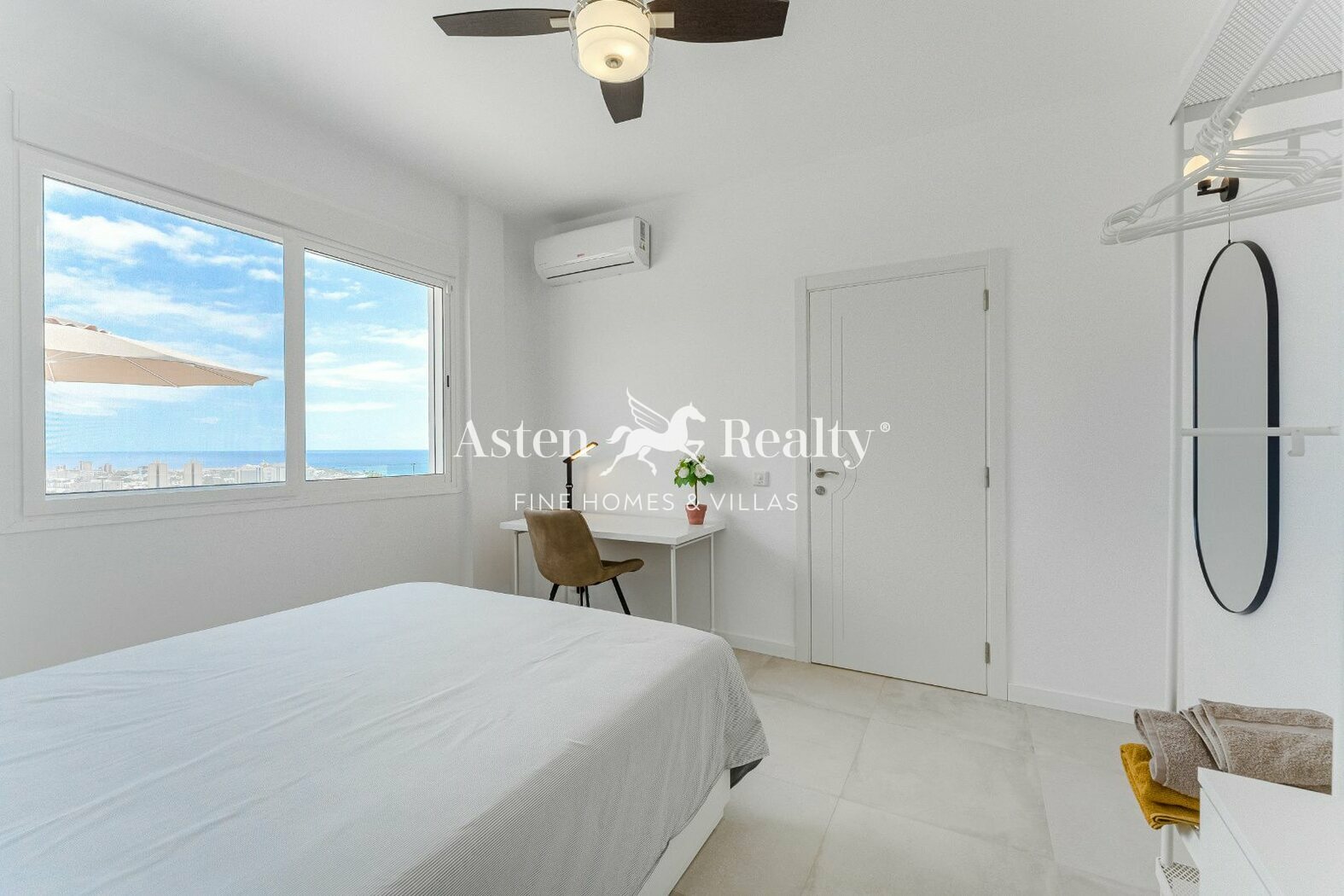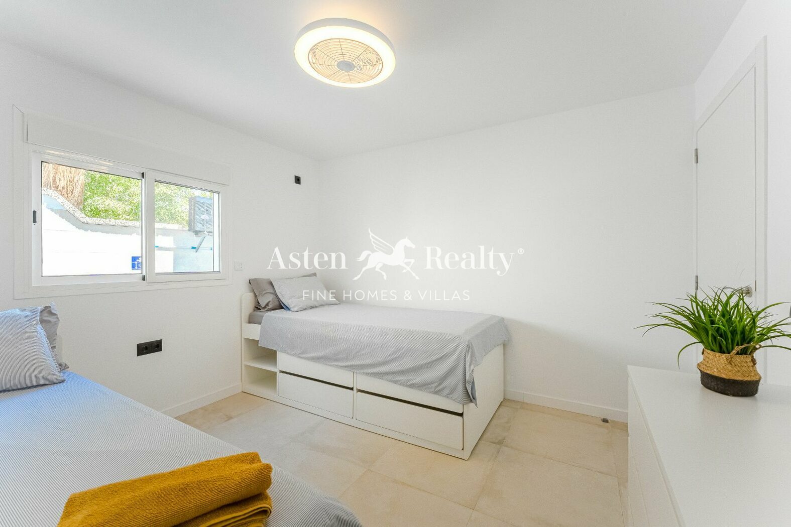 Внутренняя планировка тщательно продумана для максимального комфорта и уединения. На первом этаже расположены полностью оборудованная кухня с обеденной зоной, три спальни и две ванные комнаты. С этого уровня есть прямой выход на просторную террасу и в прекрасно благоустроенный сад с новым частным подогреваемым бассейном с солёной водой (завершён в 2024 году). На верхнем этаже находится светлая гостиная с панорамным видом на море, ещё две спальни и две ванные комнаты.